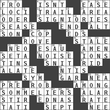 ACROSS 1. Away 4. Is not 8. Relaxation 12. Venues 14. Get behind 16. Type of rug 17. River in Europe 18. Seigniories (variant) 20. Gospel singer Marvin 22. Conclude 23. Keyboard modifier key 24. Boy, to dad 25. Police officer (slang) 28. Begley and Asner 30. Be footloose 31. Having lost freshness 35. Modern: prefix 37. He sold his birthright 40. So be it 41. Bristle 42. Annoying sound 44. Charged atoms 45. Airtight sealed metal containers 46. In a ____ (agitated or irritated) 47. To free from 48. Having winglike extensions 50. Nuclear Threat Initiatives 52. Symbol (abbr.) 54. Slender fish 55. Teachers' org. 58. Before (prefix) 61. Director Reiner 63. Amid 65. Wine waiters 70. Having or resembling wings 71. Disorderly outburst 72. Ferber et al. 73. Pace 74. Jacques of French films 75. Back-to-school mo. 76. Born DOWN 1. Soft thread for cleaning between teeth 2. Cowboy competition 3. Sea 4. It is 5. _ Lanka 6. Tired old horse 7. Prong on a fork 8. Ewer handle 9. Operatic vocal solo 10. Sew up the eyelids of hawks and falcons 11. Compass direction 13. Big collection agency 15. Actor's bit 19. Probability 21. Environmental prefix 26. Baking chamber 27. Mexican monetary units 29. Flight of steps 30. Cooks with dry heat, as in an oven 32. Mine, in Marseilles 33. Grant temporary use of 34. Followers of ems 35. Famous astronaut Armstrong 36. Inactive volcano in Sicily 38. The 18th letter of the Arabic alphabet 39. Exploiting 41. R.R. building 43. Singer James 49. Jane of fiction 51. Lyricist Gershwin 53. Undercover agent 55. Pitcher Ryan 56. Related on the mother's side 57. Match 58. Inconspicuous attention getter 59. Round or rotation of duties 60. Give off 62. Auction offers 64. Impair 66. Medical imaging device (abbr.) 67. Compass dir. 68. Hit sharply and swiftly 69. Fast jet (abbr.)