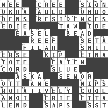 ACROSS 1. Born 4. Algonquian 8. The Jewish people; Israel 12. Gumbo ingredient 14. Old (Scot.) 15. Southwest Nigerian state 16. Cub Scout units 17. Dwellings 20. Singer Brickell 21. The 23rd letter of the Hebrew alphabet 22. Binary compound 23. Artist's stand 27. Necklace unit 29. Coral ridge 31. Stalk of a moss capsule 34. Of or pertaining to a thread or threads 35. In a ____ (agitated or irritated) 36. Celtic language 39. Monetary unit of Laos 41. Inactive volcano in Sicily 42. Carry 43. Ingested 46. Drawstring 47. Turn sharply 48. "____ silly question..." 51. Sir (Sp.) 54. Baseball player Mel 56. One (Scot) 58. Cuts off 61. Rotating or pertaining to rotation 66. Calm and collected 67. Mine, in Marseilles 68. 4th largest of the Great Lakes 69. Singer James 70. Grant temporary use of 71. Plant excrements 72. Fast jet (abbr.) DOWN 1. Connecting point 2. Made supply last 3. Bert's buddy 4. 4-wheeled motor vehicle 5. Sorrow 6. Raised railways 7. Prepare for publication 8. Male child 9. Happening 10. Wrote a lyric poem 11. Characteristic smell of wine 13. Toward the sea 18. Small moist lump or mass 19. She-sheep 24. _ Lanka 25. Snakelike fish 26. Path through which fluid escapes 28. NE Netherlands city 30. Strips of potato fried in deep fat 32. Metal container 33. "One Day ___ Time" 34. Gives food to 36. And so on (abbr.) 37. Friend of Pooh 38. Ski resort town in Vermont 40. Friends 44. Third day of the wk. 45. Car or cant ending 49. Krazy ___ of comics 50. Cuckoo 52. Single time 53. Disturbances 54. Spoken 55. Heavy book 57. Nights before holidays 59. Plant holders 60. Narrow board 62. Assist 63. Epoch 64. Mouth edge 65. Affirmative reply