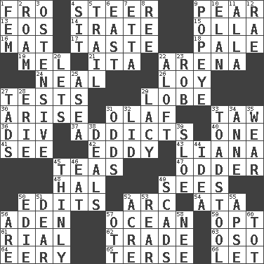ACROSS 1. Away 4. Navigate 9. Lightbulb-shaped fruit 13. Greek goddess of the dawn 14. Feeling or showing extreme anger 15. Spanish pot 16. Floor covering 17. Clothes sense 18. Light colored 19. Cartoonist voice _ Blanc 21. Call ___ day 22. Sports stadium 24. Actress Patricia 26. Myrna of the movies 27. Trials 29. Ear part 30. Ascend 31. Norwegian king 33. The 23rd letter of the Hebrew alphabet 36. HTML Container Element 37. Inveterate users 40. Single 41. Observe 42. Whirlpool 43. Climbing, woody, usually tropical vines 45. Beverages made from leaves 47. More peculiar 48. Actor Linden 49. Perceives with the eye 50. Proofreads 52. Curve 54. _ moment's notice (2 wds.) 56. An important port of Yemen 57. Sea 59. Elect 61. Monetary unit of Yemen 62. Swap 63. Bear (Spanish) 64. Suggestive of the supernatural 65. Laconic 66. Allow DOWN 1. Opposite of masc. 2. Wander aimlessly 3. Clearly or manifestly demonstrative 4. Be seated 5. Get behind 6. Compass direction 7. Singer James 8. To sift 9. Wimpy's pal 10. Liveliness 11. Silent film actress Nazimova 12. Actress Charlotte 20. Allows 22. High up in or into the air 23. Director Reiner 25. At sea 27. Bits 28. One of the Great Lakes 29. Made of lace 31. Probability 32. Hat (slang) 33. Inedible or poisonous agaric 34. Queen of England 1702-14 35. Put on (as clothing) 38. Allots cards 39. _ gin 44. It may be bright or harebrained 45. Without force or sincere effort 46. Erode 49. Heaps 50. Singer Brickell 51. Letter starter 52. 1/640 square mile 53. Posterior 55. Domed church section 56. "We ___ not amused" (Victoria) 57. Baseball player Mel 58. Born 60. Small child