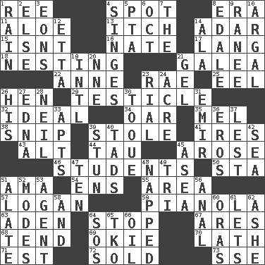 ACROSS 1. Portuguese money of account (variant) 4. Blemish 8. Period 11. _ vera 13. Hankering 14. The sixth month of the Jewish calendar 15. Is not 16. Nathan's nickname 17. Long (Scottish) 18. Nestling 21. An organ shaped like a helmet 22. Singer Murray 23. Actress Charlotte 25. Snakelike fish 26. Layer 29. One of the two male reproductive glands 32. Perfect 34. Boat paddle 35. Cartoonist voice _ Blanc 38. Clip 39. Took without asking 41. Angers 43. Keyboard modifier key 44. The 19th letter of the Greek alphabet 45. Came up 46. SAT takers 50. R.R. building 51. Nanny (var.) 54. Followers of ems 55. Length times width 57. Utah city north of Ogden 59. Player piano 63. An important port of Yemen 64. Close up, plug up 67. Ancient Greek god of war 68. Look after 69. Migrant worker of the '30s 70. Thin strip of wood or metal 71. Eastern Standard Time (abbr.) 72. Disposed of to a purchaser 73. Compass dir. DOWN 1. Water falling in drops from the sky 2. Otherwise 3. Immeasurably long periods of time 4. Scorches 5. Parent Teacher Assoc. 6. Sep. follower 7. Definite Article 8. Peak District village in England 9. Indian princess (variant) 10. Therefore, facetiously 12. Singer James 14. Chicken ___ king 19. International (abbr.) 20. Compass dir. 21. Set 23. Monetary unit of Yemen 24. Measure of real estate 26. Part of HMS, perhaps 27. Pulitzer Prize-winning author Ferber 28. Famous astronaut Armstrong 30. Woman's close-fitting hat 31. Independent ruler or chieftain 33. Tenement units (abbr.) 36. Greek god of love 37. For fear that 39. Astound 40. Bits 42. Ocean 45. Toward the sea 47. "___ Little Indians" 48. Slept 49. Three (prefix) 51. Having winglike extensions 52. Methods 53. Rep 56. Of or related to the anus 58. Added to 60. Mouths or openings 61. Allows 62. American tennis player Robert 64. Distress signal 65. Ring climax 66. Lubricate