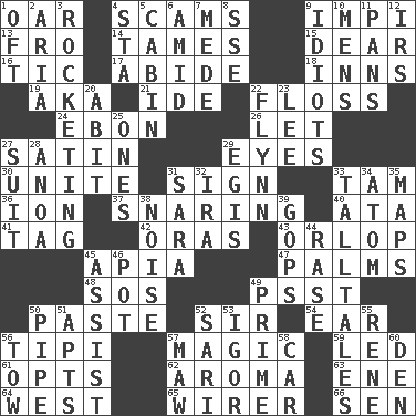 ACROSS 1. Rowing implement 4. Fraudulent business schemes 9. Body of Kaffir warriors 13. Back 14. Softens 15. Letter starter 16. Nervous spasm 17. Tolerate 18. Restaurants 19. Alias (abbr.) 21. Binary compound 22. Soft thread for cleaning between teeth 24. Inky black, to poets 26. Allow 27. Smooth fabric 29. Sight organs 30. Join together 31. Public display of a written message 33. Scottish cap 36. Electrically charged atom 37. Catching in a trap 40. _ moment's notice (2 wds.) 41. Label 42. Mouths or openings 43. Lowest deck of a ship 45. Capital of Western Samoa 47. Insides of hands 48. Mayday 49. Inconspicuous attention getter 50. Thick mixture 52. Title for a knight 54. Ewer handle 56. Native american tent (variation) 57. Mysterious quality of enchantment 59. Directed 61. Chooses 62. Scent 63. Compass dir. 64. 270 degrees 65. One who wires 66. Elected rep. DOWN 1. Often (poetically) 2. Operatic vocal solo 3. Shooting up abruptly 4. R.R. building 5. Small house or cottage 6. Among 7. Ancient Persian 8. Compass dir. 9. Foolish or stupid persons 10. Not women's 11. Zero-star reviews 12. Big collection agency 20. "This won't hurt ____!" 22. Film actor Errol 23. Area sheltered from the wind 25. Singles 27. Set of matching outer garments 28. Small Philippine buffalo 29. The front part of a cuirass 31. "Two Mules for Sister ____" 32. Lyricist Gershwin 33. Baron Munchausen's specialties 34. Tiny particle 35. Atlas contents 38. Annoying sound 39. Republicans 44. To erase 45. Help 46. Cooking vessel 49. A-one 50. Corncob 51. Flats, for short 52. Indian skirt 53. Composer Stravinsky 55. French philosopher Descartes 56. Pull behind 57. Informal term for the mouth 58. Auto 60. Lair