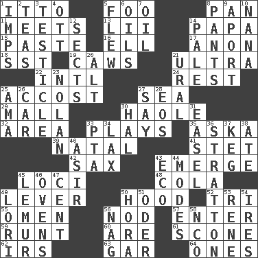 ACROSS 1. "Tell ____ the Marines!" 5. Egg _ yung 8. Baking dish 11. Confronts 13. Cards in a Roman deck? 14. Dad 15. Thick mixture 16. Pipe bend 17. At once, immediately (arch.) 18. Fast jet (abbr.) 19. Crow sounds 21. Extreme 22. International (abbr.) 24. Respite 25. Buttonhole 27. Ocean 29. Promenade 30. White Person, in Hawaii 32. Type of rug 33. Romps 35. "____ silly question..." 39. Brizilian seaport 41. Proofreading order 42. Saxophone 43. Develop 45. Venues 48. Root beer relative 49. Prying instrument 50. Parka part 52. Three (prefix) 55. Sign of something about to happen 56. Dreamland 57. Keyboard key 59. The smallest animal of a litter 60. "We ___ not amused" (Victoria) 61. Biscuitlike quick bread 62. Big collection agency 63. Slender fish 64. Singles DOWN 1. Naughty children 2. Afternoon social gatherings 3. One of the two male reproductive glands 4. Baseball player Mel 5. Soared 6. Lubricates 7. Petroleum 8. Leg coverings 9. To the left, to Queeg 10. Grandmother 12. Religious groups 14. Light colored 20. The first octave above the treble staff 21. Mountain range 23. Pitcher Ryan 25. Nursemaid (var.) 26. Auto 27. Declare 28. Greek goddess of the dawn 30. Actor Linden 31. Artist's stand 33. Parent Teacher Association (abbr.) 34. Not strict 36. Ski resort town in Vermont 37. Barrel 38. Had dinner 40. SW Saudi Arabia district 43. Environmental prefix 44. Methods 45. Arboreal primate 46. Baking chambers 47. Penny 49. Australian parrot (variant) 50. Israeli folk dance 51. Baltic tributary 53. French philosopher Descartes 54. Angers 56. Tired old horse 58. Non-commissioned officer (abbr.)