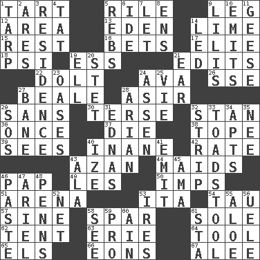 ACROSS 1. Small pie 5. Cause heat under the collar 9. Part of a journey 12. Type of rug 13. Locale of original sin 14. Welles in "The Third Man" 15. Take ten 16. Antes 17. Writer Wiesel 18. Air pressure measure (abbr.) 19. Double-curved letter 21. Proofreads 22. Dunce 24. Actress Gardner 26. Compass dir. 27. Calif. Air Force Base 28. SW Saudi Arabia district 29. Without 30. Laconic 32. Comedian Laurel of Laurel & Hardy 36. Single time 37. Expire 38. Drink excessively 39. Perceives with the eye 40. Lacking in sense or substance 42. Pace 43. Muslim summons to prayer 44. Unmarried girls 46. Infant food 49. French article 50. Naughty children 51. Sports stadium 53. Call ___ day 54. The 19th letter of the Greek alphabet 57. Trig term 58. Practice fight 61. Flatfish 62. Portable shelter 63. 4th largest of the Great Lakes 64. Utensil 65. Raised railways 66. Immeasurably long periods of time 67. Toward shelter DOWN 1. Canvas cover 2. Ancient Greek god of war 3. Home 4. Make lace 5. Confederate soldiers (slang) 6. Binary compound 7. Allow 8. Followers of ems 9. Ms. Damita and namesakes 10. Sends forth 11. Honkers 14. Directed 19. Pipe bend 20. Proofreading order 21. Hearing organ 23. Fertile tracts in a desert 24. NE Netherlands city 25. Compete 27. Object of repulsion 28. Believer in; advocate of (suffix) 29. Mayday 31. Ferber et al. 32. Empty completely 33. Inedible or poisonous agaric 34. Flats, for short 35. Born 40. Ending with capital 41. Send forth 43. In the manner of 45. Wet nurse (var.) 46. Thick mixture 47. Satellite of Uranus 48. Actor Sean's family 52. Fish or hair follower 53. Angers 55. Medicinal plant 56. Ubangi River tributary 58. Observe 59. Adept person 60. The 18th letter of the Arabic alphabet 61. R.R. building