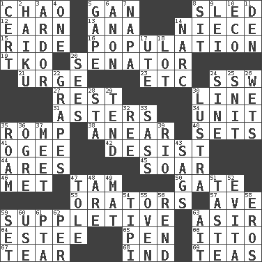ACROSS 1. US Secretary of Labor Elaine L. _ 5. Separate the seeds from cotton 8. Downhill vehicle 12. Merit 13. Santa ___, CA 14. Sibling's daughter 15. Travel on an animal 16. Census information 19. Ring climax 20. Elected representative 21. Goad 23. And so on (abbr.) 24. Compass dir. 27. Repose 30. Actor's bit 31. Michaelmas daisies 34. A single undivided whole 35. Play 38. Approach 40. Arranges properly for use 41. Double curve, resembling the letter S 42. Stop 44. Ancient Greek god of war 45. Fly high 46. Was introduced to 47. Scottish cap 50. Yard entry 53. Speakers 57. "___ Maria" 59. Supplementary 63. SW Saudi Arabia district 64. First name in cosmetics 65. Animal enclosure 66. "Tell ____ the Marines!" 67. Rend 68. Indiana (abbr.) 69. Beverages made from leaves DOWN 1. An absolute certainty 2. Japanese verse 3. Zeal 4. Single 5. Open wide 6. At once, immediately (arch.) 7. California wine valley 8. Be seated 9. Flowery wreath 10. Environmental prefix 11. Lair 14. Drug cop 17. Shoshoni 18. Car dealer's back yard 20. Perceives with the eye 22. Wine fruits 24. Trig term 25. In a ____ (agitated or irritated) 26. Moistens 28. R.R. building 29. Watch over 30. A period of five years 32. To riddle 33. Backtalk 35. Wander aimlessly 36. Legendary monster 37. Confront 39. River (Sp.) 43. Settles 47. Lacquered or enameled metalware 48. "We ___ not amused" (Victoria) 49. Floor covering 51. Clothes sense 52. Webber/Rice musical 54. Native american tent (variation) 55. Baking chamber 56. Tear apart 58. Greek god of love 59. Arrange properly for use 60. Purpose 61. Parent Teacher Assoc. 62. For each 63. Small island