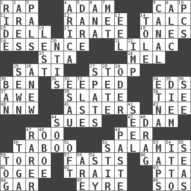 ACROSS 1. Strike 4. First man 8. Head covering 11. Lyricist Gershwin 12. The wife of a rajah (variant) 14. Baby powder 15. Small valley 17. Feeling or showing extreme anger 18. Washington bills 19. Center 21. Pale purple color 23. R.R. building 24. Cartoonist voice _ Blanc 25. Suttee (variant) 27. Obstruct or block passage 30. Benjamin's nick name 31. Oozed 34. Begley and Asner 37. Deep reverence 38. Schedule 39. Neckwear 40. Compass dir. 41. Michaelmas daisies 43. Born 44. Takes to court 45. Dutch treat 47. Friend of Pooh 49. For each 50. Off limits 52. Deli grouping 56. "Corrida" creature 57. Goes without food and/or water 60. Yard entry 61. Double curve, resembling the letter S 62. Distinguishing feature 63. Parent Teacher Assoc. 64. Slender fish 65. Jane of fiction 66. Distress signal DOWN 1. Travel on an animal 2. Ancient Greek god of war 3. Friends 4. N. Chile seaport 5. Have the gumption 6. Santa ___, CA 7. Was introduced to 8. Lessep's creation 9. Actor Baldwin 10. Personal Computers (abbr.) 13. Snakelike fish 14. Lacquered or enameled metalware 16. For fear that 20. Nuclear Threat Initiatives 22. Mischievous child 25. Stitched 26. Afresh 27. Arguments over trivial matters 28. Wig 29. River in Europe 30. Forbid 32. He sold his birthright 33. Otherwise 34. Inactive volcano in Sicily 35. South Vietnam president (1954) 36. Perceive with the eye 42. Stitch closed the eyes of (a falcon) 44. "Barney Miller" actor Jack 46. To be drawn or hauled along 47. More valued for its uncommonness 48. Mitch Miller's instrument 49. Thick mixture 50. Ancient Roman robe 51. Often (poetically) 52. Use a spoon 53. Atlas contents 54. "Tell ____ the Marines!" 55. Oceans 56. Coat; cloak 58. "We ___ not amused" (Victoria) 59. Declare