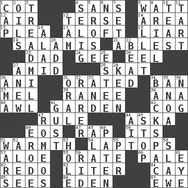 ACROSS 1. Small bed 4. Without 8. Electrical Unit 12. Wind 13. Laconic 14. Length times width 15. Entreaty 17. Upward 18. One who doesn't tell the truth 19. Deli grouping 21. Most capable 23. June honoree 24. Unit of force equal to gravity 26. Snakelike fish 27. Among 28. Three-handed card game 30. Black tropical American cuckoo 31. Spoke pompously 34. Prohibit 37. Cartoonist voice _ Blanc 38. The wife of a rajah (variant) 39. Santa ___, CA 40. Leather borer 41. Place where plants grow 42. Gear tooth 43. General guideline 44. "____ silly question..." 46. Greek goddess of the dawn 47. Reproach for some lapse or misdeed 50. ___ a Wonderful Life 51. Heat 54. Portable computers 57. _ vera 58. Speak pompously 60. Light colored 62. Do over again 63. 61 cubic inches 64. Island 65. Observes 66. Locale of original sin 67. She-sheep DOWN 1. Head covering 2. Lubricates 3. Excercise machine 4. Former Milwaukee Brewers owner Bud 5. Came up 6. Science/research agcy. 7. Stalk of a moss capsule 8. Place for singles 9. Satellite of Uranus 10. Afternoon social gatherings 11. Small pie 13. Scottish cap 16. Mountain range southwest of Kyrgyzstan 20. Say or write further 22. Necklace unit 25. First name in cosmetics 27. Afresh 29. Peachy ____! 30. Nursemaid (var.) 31. Of the mouth 32. More valued for its uncommonness 33. Also 34. Keyboard key 35. Small Philippine buffalo 36. Tired old horse 41. Abrupt rush of wind 43. Lover boys 44. Small island 45. Halt 46. Eat (away) 48. Having winglike extensions 49. Eucharist need 51. Armed conflicts 52. Toward shelter 53. Hollow 55. For each 56. Cole _ (cabbage dish) 59. To free from 61. Sight organ
