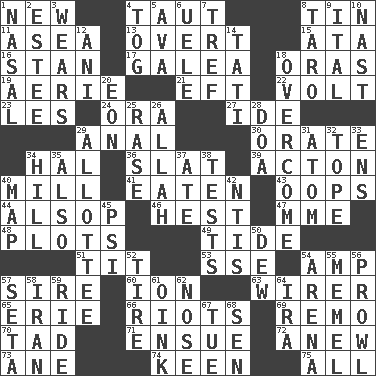 ACROSS 1. ___ Haven, CT 4. Drawn tight 8. Shallow baking pan 11. Toward the sea 13. Unconcealed 15. _ moment's notice (2 wds.) 16. Comedian Laurel of Laurel & Hardy 17. An organ shaped like a helmet 18. Mouths or openings 19. Nest on high 21. Bank Draft (abbr.) 22. Electrical Unit 23. French article 24. Mouth or opening 27. Binary compound 29. Of or related to the anus 30. Declaim 34. Actor Linden 36. Narrow board 39. Gambison 40. Place where flour is made 41. Consumed 43. I made a mistake 44. Columnist Joseph or Stewart 46. Behest 47. Madame (abbr.) 48. Small pieces of grounds 49. Periodic rise and fall of the sea level 51. Teat (slang) 53. Compass dir. 54. Electrical Unit 57. The founder of a family 60. Electrically charged atom 63. One who wires 65. One of the Great Lakes 66. Disturbances 69. San ____ (Riviera town) 70. Small amount or degree 71. Follow as a consequence or result 72. Afresh 73. One (Scot) 74. Peachy ____! 75. Everything DOWN 1. Relating to the nose 2. First name in cosmetics 3. Erodes 4. Coat; cloak 5. Actress Gardner 6. Ubangi River tributary 7. Not kosher 8. Pacific island yam 9. Slanted text style (abbr.) 10. Political cartoonist Thomas 12. Black tropical American cuckoo 14. Jacques of French films 18. Conquer 20. Period of immesurable duration 25. Raze (variant) 26. Assad's deity 28. ___ good deed 29. One to whom something is allotted 31. Smallest unit of an element 32. Drink excessively 33. Followers of ems 34. Land elevation 35. In addition 37. Had dinner 38. Trials 40. Atlas unit 42. Nuclear Threat Initiatives 45. Air pressure measure (abbr.) 50. Morning condensation 52. Become fatigued 54. Sports stadium 55. Klaipeda city 56. Move like a hungry wolf 57. Bristle 58. SW Asia republic 59. Travel on or in a vehicle 61. Pig sound 62. Characteristic smell of wine 64. Lyricist Gershwin 67. Third day of the wk. 68. Elected rep.