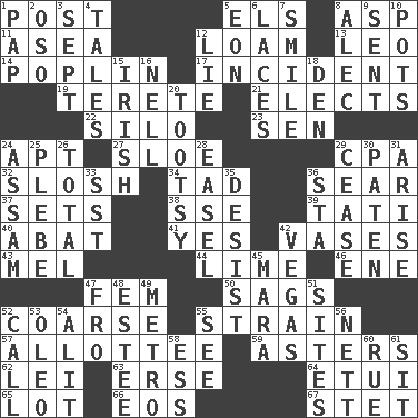 ACROSS 1. Mail 5. Raised railways 8. Viper 11. At sea 12. Rich soil 13. Lion 14. Cotton for raincoats, e.g. 17. Event 19. Cigar-shaped 21. Opts 22. Grain storage tower 23. Elected rep. 24. Fitting 27. _ gin 29. Numbers guy (abbr.) 32. Splash clumsily 34. Small boy 36. Wither 37. Arranges properly for use 38. Compass dir. 39. Jacques of French films 40. Blind as ____ 41. It is so 42. Flower holders 43. Cartoonist voice _ Blanc 44. Welles in "The Third Man" 46. Compass dir. 47. Opposite of masc. 50. Sinks 52. Rough 55. Put through a sieve 57. One to whom something is allotted 59. Michaelmas daisies 62. Flowery wreath 63. Celtic language 64. Needle case 65. Car dealer's back yard 66. Greek goddess of the dawn 67. Proofreading order DOWN 1. Infant food 2. Bear (Spanish) 3. Back-to-school mo. 4. Stories 5. Period of immesurable duration 6. Shoestrings 7. Grin 8. Actor Baldwin 9. Emitted 10. Cooking vessels 12. Whopper 15. From or relating to Ireland 16. 1994 drama film starring Jodie Foster 18. Lair 20. A girl or young woman (variant) 24. Indian state 25. Cadet 26. "_____ Recall" 28. Artist's stand 29. Stop 30. Eucharist need 31. Get up 33. Fast jet (abbr.) 35. Stop 36. R.R. building 42. Viva Las _ 45. Hindu Mythology: god of death 47. From 48. First name in cosmetics 49. Paris' subway 51. Locates 52. Give a ring to 53. Margarine 54. Came down and settled, as after flight 55. Perceive with the eye 56. Remaining after all deductions 58. Double-curved letter 60. Sorrow 61. Be seated