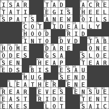 ACROSS 1. Austrian river, tributary to the Danube 5. Small boy 8. Land measure 12. Jacques of French films 13. Armor plate that protects the chest 15. Person who is morally reprehensible 16. Arguments over trivial matters 18. Afresh 19. Lubricates 20. Small bed 22. Under perfect conditions 24. Parka part 26. To free from 27. To the inside or interior of 28. Movie disc 29. Bar bill 32. Dwelling 35. Have the gumption 37. Single 38. Lyric poems 39. Girls' org. (abbr.) 40. A type of plum 41. Elected rep. 42. Pile 43. Lacerate 44. Begley and Asner 45. Twice 46. Son of Isaac 49. Large cup 50. Transmit 51. Cordwainer's material 55. Compass dir. 56. Buttocks 57. Nights before holidays 59. Take place subsequently 63. Compass direction 64. Travel on or in a vehicle 65. Portable shelter 66. Makes supply last 67. Car dealer's back yard 68. Ketch in the Levant DOWN 1. ___ a Wonderful Life 2. Plant excrement 3. "One Day ___ Time" 4. Actors Guy, Robert Welles, and Clint 5. Beverage made from leaves 6. Hindu god of fire 7. Passed on 8. Hold, grip (Informal) 9. To provide with a ceiling 10. Depend 11. Raised railways 14. Turn aside suddenly 17. Within a short period 21. Small child 23. Assist 25. Evades 28. Window treatments 29. Lacquered or enameled metalware 30. Small Philippine buffalo 31. Fermented drink made from hops 32. Stockings 33. Wrote a lyric poem 34. Not women's 36. White ___ sheet 40. SAT takers 42. Having greater elevation 45. On the contrary 47. Observe 48. Singer Murray 49. Shops 51. Path through which fluid escapes 52. Relaxation 53. Tending to cause great harm 54. Make new 56. Portuguese money of account (variant) 58. Put into a specified state 60. Ocean 61. Corn or form start 62. And so on (abbr.)
