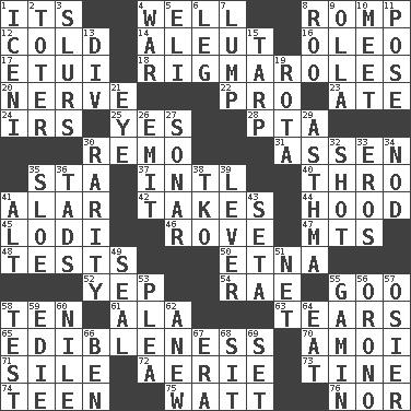 ACROSS 1. ___ a Wonderful Life 4. Water source 8. Play 12. Lacking warmth 14. Native American of Southwest Alaska 16. Butter sub 17. Needle holder 18. Complicated, petty procedures 20. Boldness 22. Adept person 23. Had dinner 24. Big collection agency 25. It is so 28. Parent Teacher Assoc. 30. San ____ (Riviera town) 31. NE Netherlands city 35. R.R. building 37. International (abbr.) 40. Through, poetically 41. Having or resembling wings 42. Receives possession of 44. Parka part 45. Farming town in central California 46. Be footloose 47. Mountains (abbr.) 48. Trials 50. Inactive volcano in Sicily 52. Slangy assent 54. Actress Charlotte 55. Thick or sticky substance 58. Nine, plus one 61. Chicken ___ king 63. Rends 65. The property of being fit to eat 70. Mine, in Marseilles 71. Drop; flow; fall 72. Nest on high 73. Prong on a fork 74. Adolescent 75. Electrical Unit 76. Not either DOWN 1. Ancient Celtic tribe of eastern Britain 2. Carrier 3. Disparaging remarks 4. Armed conflict 5. Biblical high priest 6. Part of a journey 7. Mass 8. Friend of Pooh 9. Rounded earthenware pot or jar 10. Rendezvous 11. Introduce or present, as a question 13. HTML Container Element 15. Canvas cover 19. Round or rotation of duties 21. Sight organ 26. Give off 27. Echolocation 29. Respiratory problem 30. Noteworthy scarcity 32. Opportunity 33. Greek god of love 34. Dreamland 35. A type of plum 36. Bits 38. Ring climax 39. Crowbar 41. The first octave above the treble staff 43. Bristle 49. Lick closed 51. Fish or hair follower 53. Entreaty 55. Homeless child 56. U. of Maine site 57. Flexible twig of a willow tree 58. Trial 59. Singer Brickell 60. The longest river in the world 62. Afresh 64. Consume 66. Benjamin's nick name 67. Epoch 68. Be seated 69. Put into a specified state