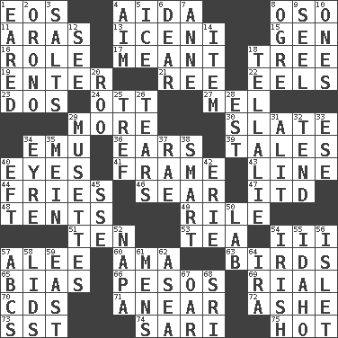 ACROSS 1. Greek goddess of the dawn 4. Opera by Verdi 8. Bear (Spanish) 11. Caspian sea tributary 13. Ancient Celtic tribe of eastern Britain 15. Commissioned military rank (abbr.) 16. Hero or heavy, e.g. 17. Intended 18. Woody plant 19. Keyboard key 21. To riddle 22. Snakelike fish 23. Two (Sp.) 24. Baseball player Mel 27. Cartoonist voice _ Blanc 29. Greater amount 30. Chalkboard 34. Australian flightless bird 36. Hearing organs 39. Stories 40. Snake ____ (dice throw) 41. Movie unit 43. Actor's bit 44. Strips of potato fried in deep fat 46. Scorch 47. It would 48. Portable shelters 49. Cause heat under the collar 51. "___ Little Indians" 53. Afternoon social gathering 54. One more than two 57. Toward shelter 60. Nursemaid (var.) 63. Avian creatures 65. Prejudice 66. Mexican monetary units 69. Monetary unit of Yemen 70. Music discs 71. Approach 72. American tennis player Robert 73. Fast jet (abbr.) 74. Indian skirt 75. Being at a high temperature DOWN 1. Having ears or earlike features 2. U. of Maine site 3. Table seasonings 4. Direct toward a target or goal 5. Frozen water 6. Letter starter 7. Queen of England 1702-14 8. Legendary monster 9. Stitch closed the eyes of (a falcon) 10. Singles 12. Perceive with the eye 14. A distinct part 18. Copy Pinocchio 20. Friend of Pooh 25. Not kosher 26. Pulls into pieces 28. Eastern Standard Time (abbr.) 29. French bagpipes 31. Set down 32. Be inclined (to) 33. Compass dir. 34. Jane of fiction 35. Count _ (2 wds.) 37. Actress Charlotte 38. Don Adams' spy role 40. Lizard (obsolete) 42. One of the Great Lakes 45. Compass dir. 50. Experiment locale 52. California wine valley 54. From or relating to Ireland 55. Potato state 56. Small island 57. Lettered men learn these first 58. Flaplike coverings 59. 90 degrees 61. Not women's 62. At sea 64. Retirement account (abbr.) 67. Boat paddle 68. _ Lanka