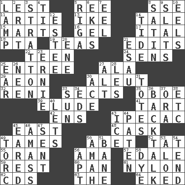 ACROSS 1. For fear that 5. To riddle 8. Compass dir. 11. Nick name for Arthur 13. Mamie's mate 14. Story 15. Shops 16. Set 17. Slanted text style (abbr.) 18. Parent Teacher Association (abbr.) 19. Beverages made from leaves 21. Proofreads 22. Adolescent 24. Elected reps. 25. Main course 27. Insect wing 29. Period of immesurable duration 30. Eskimo relative 32. Painter Guido (1575-1642) 33. Religious groups 35. Mitch Miller's instrument 39. Dodge 41. Small pie 42. Followers of ems 43. Medicinal drug used to evoke vomiting 45. Compass direction 48. Keg 49. Domesticates 50. Collude with 52. Make lace 55. NW Algerian seaport 56. Nanny (var.) 57. Peak District village in England 59. Respite 60. Baking dish 61. Thermoplastic polyamide 62. Music discs 63. Definite Article 64. Made supply last DOWN 1. Desk light 2. Part of Q.E.F. 3. Ski resort town in Vermont 4. Teat (slang) 5. Port city in Latvia 6. Makes supply last 7. Snakelike fish 8. Smooth fabric 9. Narrow boards 10. Snakelike fish 12. First name in cosmetics 14. Event that recurs at intervals 20. Compass dir. 21. He sold his birthright 23. Bert's buddy 25. Ewer handle 26. Born 27. Keyboard modifier key 28. French article 30. Adept person 31. Hauls 33. Player for Phoenix 34. Begley and Asner 36. Sass 37. Mouth or opening 38. And so on (abbr.) 40. Allows 43. Frozen water 44. Eucharist need 45. Having ears or earlike features 46. Collect or gather 47. Posted 49. Torque (variant) 50. Nanny 51. Object of repulsion 53. Medicinal plant 54. Watch over 56. Fitting 58. Color