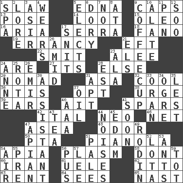 ACROSS 1. Cole _ (cabbage dish) 5. Pulitzer Prize-winning author Ferber 9. Balmoral and tarboosh 13. Introduce or present, as a question 14. Plunder 15. Butter sub 16. Operatic vocal solo 17. Father Junipero _ 18. Papal veil 19. The state or an instance of erring 21. Lizard (obsolete) 22. Stricken, poetically 23. Toward shelter 24. "We ___ not amused" (Victoria) 27. ___ a Wonderful Life 28. Otherwise 29. Wanderer 31. White ___ sheet 32. Calm and collected 36. Nuclear Threat Initiatives 37. Choose 38. Goad 39. Hearing organs 40. Small island 41. Practice fights 42. Slanted text style (abbr.) 44. Modern: prefix 46. Fish or hair follower 47. Toward the sea 48. Aroma 50. Parent Teacher Association (abbr.) 51. Player piano 54. Capital of Western Samoa 56. Suffix with ecto or cyto 58. Do not 60. SW Asia republic 61. Ubangi River tributary 62. "Tell ____ the Marines!" 63. Monthly bill 64. Perceives with the eye 65. Political cartoonist Thomas DOWN 1. Health resort 2. Old wives' tales, e.g. 3. SW Saudi Arabia district 4. Erodes 5. Chooses 6. Small, narrow, flatbottom fishing boat 7. Not either 8. _ moment's notice (2 wds.) 9. Java holder (2 wds.) 10. Having winglike extensions 11. Animal enclosure 12. "Barney Miller" actor Jack 17. In a ____ (agitated or irritated) 20. Among 21. Raised railways 23. Insect wing 24. Queen of England 1702-14 25. Roll call or roster of names 26. Arab leader 28. Eastern Standard Time (abbr.) 30. Aide 31. Fitting 33. Northwest Algerian city 34. Legendary monster 35. For fear that 37. Petroleum 40. Auto club (abbr.) 41. Within a short period 43. Afternoon social gathering 44. Annoying sounds 45. Dutch treat 47. Bee-related 49. "The Thinker" sculptor 51. Diluted with white 52. Globular water bottle used in Asia 53. Pismires 54. Wind 55. Before (prefix) 56. Ichor 57. Area sheltered from the wind 59. Small child