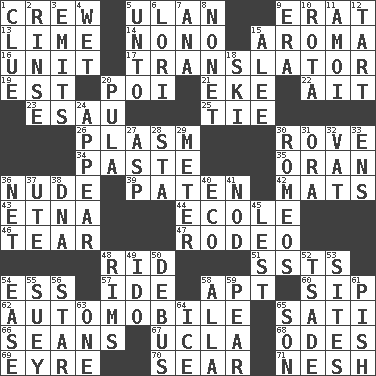ACROSS 1. Group working together 5. Uhlan (variant) 9. Part of Q.E.F. 13. Welles in "The Third Man" 14. Words to Nanette 15. Odor 16. A single undivided whole 17. Interpreter 19. Eastern Standard Time (abbr.) 20. Luau course 21. Supplement with great effort 22. Small island 23. He sold his birthright 25. Make a knot 26. Suffix with ecto or cyto 30. Be footloose 34. Thick mixture 35. Northwest Algerian city 36. Naked 39. Eucharist need 42. Floor coverings 43. Inactive volcano in Sicily 44. Learning spot: Fr. 46. Separate forcefully 47. Cowboy competition 48. To free from 51. Fast planes 54. Curvy letter 57. Binary compound 58. Fitting 60. Small drink 62. Car 65. Suttee (variant) 66. Actors Connery and Penn 67. Southern CA. univ. 68. Lyric poems 69. Jane of fiction 70. Scorch 71. Tender DOWN 1. A slight indication 2. Wash lightly 3. Sends forth 4. Soggy 5. To (old English) 6. Australian parrot (variant) 7. Santa ___, CA 8. Music written for nine 9. Epoch 10. Round or rotation of duties 11. Mine, in Marseilles 12. Small pie 15. Toward shelter 18. What Jean-Claude Killy likes to do 20. Monetary unit of Botswana 24. Become visible 27. Viper 28. R.R. building 29. Distance measurement 30. Lover boys 31. Mouth or opening 32. Large container 33. Followers of ems 36. Fish or hair follower 37. Shoshoni 38. Heredity factor (abbr.) 40. Environmental prefix 41. Allow head to fall sleepily 45. For fear that 48. Basketball hoops 49. Wedding promise 50. To get out of a bus 52. Sadhe (variant) 53. Settings 54. Relaxation 55. Chop _ 56. Play the lead 58. Silent film actress Nazimova 59. Lightbulb-shaped fruit 61. Expression of disdain 63. Single 64. Frozen water 65. Boy, to dad