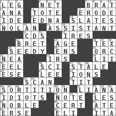 ACROSS 1. Part of a journey 4. Fish or hair follower 7. Naughty child 11. Santa ___, CA 12. Haul 13. Wear away 14. Binary compound 15. Pulitzer Prize-winning author Ferber 16. Chalkboards 17. Pitcher Ryan 19. Helper 21. Music discs 23. Angers 24. Cy Young winner Saberhagen 25. Ripen 26. John Ritter's dad 29. Morally degraded 30. Followers of ems 31. The grampus (Milton) 32. Teachers' org. 33. Big collection agency 34. Cards in a Roman deck? 35. Snakelike fish 36. _-fi 37. Showing deterioration from age 40. Compass dir. 41. Area sheltered from the wind 42. Charged particles 43. Examine minutely or intensely 45. Teat (slang) 46. Conclusion 51. Climbing, woody, usually tropical vines 55. Foolish or stupid persons 56. Short letter 58. French article 59. Impressive in appearance 60. Certainty 61. Had dinner 62. Celtic language 63. Biblical high priest 64. Call ___ day DOWN 1. (Had) reclined 2. Inside; within (prefix) 3. Highlander 4. Allow head to fall sleepily 5. Inactive volcano in Sicily 6. Beverages made from leaves 7. Naughty children 8. Round or rotation of duties 9. Arabian gulf 10. Trial 12. Watched over 13. Otherwise 16. Titles for men of rank and authority 18. 43,560 square feet 20. Omens 22. Filthy place 24. Calif. Air Force Base 25. Nest on high 26. For Whom the Bell _____ 27. One of the Great Lakes 28. One more than ninety 29. Observes 32. Born 33. Ancient Celtic tribe of eastern Britain 36. Narrow boards 37. Be seated 38. Rest room 39. Against 43. Fur scarf 44. Quote 46. Trig term 47. Aroma 48. Chest bones 49. At one time in the past 50. Christmas carol 52. Jai ____ 53. Remaining after all deductions 54. Toward the sea 57. Three (prefix)