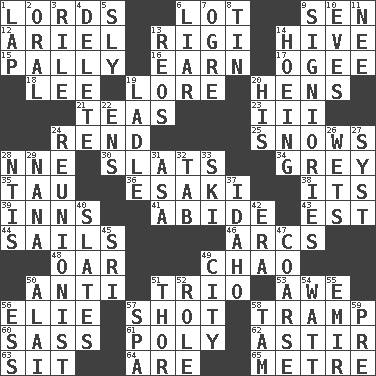 ACROSS 1. Nobles 6. Car dealer's back yard 9. Elected rep. 12. Satellite of Uranus 13. Swiss mountan, "Queen of the Mountains" 14. Hub of activity 15. Chummy 16. Merit 17. Double curve, resembling the letter S 18. Area sheltered from the wind 19. Old wives' tales, e.g. 20. Coop moms 21. Beverages made from leaves 23. One more than two 24. Tear apart 25. Frozen precipitation (plural) 28. Compass dir. 30. Narrow boards 34. Jennifer or Joel 35. The 19th letter of the Greek alphabet 36. 1973 Nobel Price Winner (Physics) Leo 38. ___ a Wonderful Life 39. Taverns 41. Tolerate 43. Eastern Standard Time (abbr.) 44. Moves on water 46. Arches 48. Boat paddle 49. US Secretary of Labor Elaine L. _ 50. Against 51. Musical group of three 53. Deep reverence 56. Writer Wiesel 57. Attempt 58. _____ steamer (cargo ship) 60. Backtalk 61. More than one (prefix) 62. Having gotten out of bed 63. Be seated 64. "We ___ not amused" (Victoria) 65. Distance measurement (Brit.) DOWN 1. Infant locale 2. Relating to the mouth 3. Cause heat under the collar 4. Keyboard key 5. Playfully artful 6. One who doesn't tell the truth 7. Legendary monster 8. Shallow baking pan 9. Seigniories (variant) 10. Nights before holidays 11. Born 13. Vintage cars 14. Cultivating 19. Dipping utensil 20. Part of HMS, perhaps 22. Followers of ems 24. One who advocates reunion 26. Soaks 27. System (abbr.) 28. Nuclear Threat Initiatives 29. Nanny 31. White ___ sheet 32. Keyboard key 33. What Jean-Claude Killy likes to do 37. Potato state 40. Chalkboards 42. Period 45. _ Lanka 47. Rough 49. Municipality 50. Jai _ 51. Son of Odin 52. Hero or heavy, e.g. 54. Electrical Unit 55. Arab leader 56. Curvy letter 57. Health resort 58. Scottish cap 59. Before (prefix)