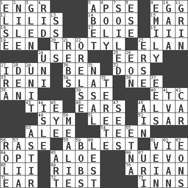 ACROSS 1. Engineer (abbr.) 5. Domed church section 9. Ovum 12. Ms. Damita and namesakes 14. Expressions of contempt or scorn 15. Third mo. 16. Bobsleighs 17. Writer Wiesel 18. One more than two 19. Car or cant ending 20. Trinitrotoluene 23. Flair 24. One who uses or employs something 25. Suggestive of the supernatural 27. Goddess of spring and wife of Bragi 30. Benjamin's nick name 32. Two (Sp.) 33. Painter Guido (1575-1642) 34. Narrow board 36. Born 38. Cuckoo 39. Compass dir. 40. And so on (abbr.) 43. Neckwear 46. Hearing organs 48. Inventor's middle name 49. Symbol (abbr.) 51. Area sheltered from the wind 52. Austrian river, tributary to the Danube 53. Toward shelter 54. Adolescent 56. Raze (variant) 58. Most capable 61. Compete 64. Elect 65. Medicinal plant 66. New (sp.) 68. Cards in a Roman deck? 69. Teases 70. Believer in; advocate of (suffix) 71. Ewer handle 72. Trial 73. Taverns DOWN 1. Otherwise 2. "Death on the ____" 3. Small, secluded valley 4. To free from 5. Collude with 6. Many (prefix) 7. Dirtied 8. Compass dir. 9. Poet Dickinson 10. Greek goddess of the earth (variant) 11. Smile widely 13. Fast planes 21. Confederate soldiers (slang) 22. Threatening words 23. Celtic language 24. Single; one (prefix) 26. A really long time 27. Lyricist Gershwin 28. Lair 29. A single undivided whole 31. Rhinal 35. Cigar-shaped 37. Snakelike fish 41. Federal power corp. 42. Auto 44. Capri or Wright 45. Sight organ 47. Observes 48. The 18th letter of the Arabic alphabet 50. Ear of corn 53. Moving about 55. Inactive volcano in Sicily 56. Hero or heavy, e.g. 57. Capital of Western Samoa 59. Moves up and down 60. For fear that 61. Distinctive style or manner 62. "Terrible" tsar 63. Immeasurably long periods of time 65. Nonscientific branch of learning 67. RI univ.