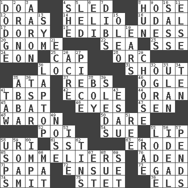 ACROSS 1. ___ good deed 4. Downhill vehicle 8. Flexible conduit 12. Mouths or openings 14. Sun: prefix 16. Allodial 17. Rowboat 18. The property of being fit to eat 20. Dwarf 22. Ocean 23. Compass dir. 24. Period of immesurable duration 25. Head covering 28. The grampus (Milton) 30. Locales 31. Yell 35. _ moment's notice (2 wds.) 37. Confederate soldiers (slang) 40. Stare 41. Cook's measure (abbr.) 42. Learning spot: Fr. 44. Northwest Algerian city 45. Blind as ____ 46. Snake ____ (dice throw) 47. Elected rep. 48. Make _____ (do battle with) 50. Have the gumption 52. Luau course 54. Take to court 55. Mouth edge 58. RI univ. 61. Fast jet (abbr.) 63. Wear away 65. Wine waiters 70. Arabian gulf 71. Dad 72. Take place subsequently 73. Mild oath 74. Stricken, poetically 75. Proofreading order 76. Raised railways DOWN 1. Evade 2. U. of Maine site 3. Composer Copland 4. A female animal or person 5. Directed 6. Biblical high priest 7. Rights 8. Attila the _ 9. Lyric poems 10. Backtalk 11. Otherwise 13. Symbol (abbr.) 15. Butter sub 19. Hearing organs 21. Environmental prefix 26. 1/640 square mile 27. Component 29. Elect 30. Portable computer 32. Legendary monster 33. ____ Bator, Mongolia 34. Nine, plus one 35. Swedish rock group 36. Russian ruler of old 38. Male child 39. Bobsleighs 41. The 23rd letter of the Hebrew alphabet 43. He sold his birthright 49. Characteristic smell of wine 51. To sift 53. Capri or Wright 55. Cabin 56. Standard of perfection 57. Hangs 58. United States Postal Service (abbr.) 59. Wander 60. Body of Kaffir warriors 62. Metal containers 64. Actress Charlotte 66. Floor protector 67. Eastern Standard Time (abbr.) 68. Sorrow 69. Put into a specified state