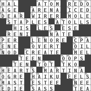 ACROSS 1. Actor Linden 4. Tiny particle 8. Make new 12. Mature 13. Sports stadium 14. On the rocks 15. Letter starter 17. One who wires 18. Undercover agent 19. Paper fasteners 21. Ringlike coral islands and reefs 23. Part of HMS, perhaps 24. French article 26. Compass dir. 27. Painter Guido (1575-1642) 28. Nathan's nickname 30. For each 31. Poe poem 34. Tax preparer (abbr.) 37. Compass dir. 38. Unconcealed 39. Petroleum 40. Allow head to fall sleepily 41. Make 42. Cartoonist voice _ Blanc 43. Adolescent 44. I made a mistake 46. Nine, plus one 47. Small child 50. Ring climax 51. Centers 54. Chrissie's court nemesis 57. Legendary monster 58. Japanese poetic form 60. Snakelike fish 62. Vertical spar for supporting sails 63. First name in cosmetics 64. Born 65. Singer Brickell 66. Backtalk 67. Beverage made from leaves DOWN 1. Possessed 2. Eons 3. Resembling or made to resemble leather 4. Satellite of Uranus 5. Laconic 6. Single 7. Hindu Mythology: god of death 8. Full of chinks, cracks, or crevices 9. Learning spot: Fr. 10. Small valley 11. Lyric poems 13. Leather borer 16. Precipitation 20. Air pressure measure (abbr.) 22. False hair 25. Derisive sound 27. Former U.S. Attorney General Janet 29. Johnson of "Laugh-In" 30. Animal enclosure 31. Old wives' tales, e.g. 32. Happening 33. Teachers' org. 34. Part 35. Sliced desserts 36. 100% 41. Penny 43. Cigar-shaped 44. Baseball player Mel 45. Migrant worker of the '30s 46. Tarsus (plural) 48. Leaves out 49. Proceeds 51. Residence 52. Mild oath 53. "______ My Girl" (Turtles hit) 55. Regret 56. Toward shelter 59. White ___ sheet 61. Ocean