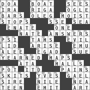 ACROSS 1. ___ good deed 4. Water vessel 8. Perceives with the eye 12. Lyricist Gershwin 13. Port city in Latvia 14. Stare at amorously 15. Oblong pieces of solid material 17. Cassini of fashion 18. Damp 19. Closes up, plugs up 21. Compass dir. 23. Ocean 24. Maternal 26. Single 28. Nathan's nickname 30. Replies 34. Air pressure measure (abbr.) 37. Scottish caps 39. Morally bad or wrong 40. Hat (slang) 41. Get up 43. Australian flightless bird 44. Toward shelter 46. Mild oath 47. Institute legal proceedings 48. Had a strong desire 51. Atlas contents 54. _ moment's notice (2 wds.) 55. Promenades 58. Cooking vessel 61. It would 63. Aches 65. Burlesque acts 67. Jacques Cousteau's middle name 71. Highlander 72. Beget 73. "Death on the ____" 74. Teachers' org. 75. Adolescent 76. Give off 77. Tate display DOWN 1. Rights 2. Speak pompously 3. Composer Copland 4. Sis' sibling 5. Petroleum 6. Grow older 7. Labels 8. "Barney Miller" actor Jack 9. Armor plate that protects the chest 10. Otherwise 11. Stalk of a moss capsule 16. Connect, as a bridge 18. Not women's 20. R.R. building 22. Manchild 25. Singer James 27. She-sheep 29. Having ears or earlike features 30. Indian state 31. Nights before holidays 32. Tall New Zealand timber tree 33. Change direction abruptly 34. Live dramatic performance 35. Filth; sediment 36. The content of cognition 38. Russian fighter aircraft 42. Dutch treat 45. Period 49. Nuclear Threat Initiatives 50. Consume 52. Infant food 53. Volcanic refuse 56. Woody, climbing, usually tropical plant 57. Scornful expression 58. Inconspicuous attention getter 59. Migrant worker of the '30s 60. Become fatigued 62. Centimeter-gram-second unit of force 64. Narrow board 66. "___ Little Indians" 68. Zeal 69. Biblical high priest 70. Put into a specified state