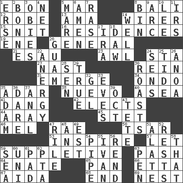 ACROSS 1. Inky black, to poets 5. Spoil 8. Indonesian resort city 12. Loose flowing garment 13. Nanny (var.) 14. One who wires 15. In a ____ (agitated or irritated) 16. Homes 19. Compass dir. 20. Commissioned military rank 21. Son of Isaac 23. Leather borer 24. R.R. building 27. Political cartoonist Thomas 30. It's straight from the horse's mouth 31. Develop 34. Southwest Nigerian state 35. The sixth month of the Jewish calendar 38. New (sp.) 40. At sea 41. Mild oath, euphamism for damn 42. Chooses 44. Like ___ of sunshine 45. Proofreading order 46. Cartoonist voice _ Blanc 47. Actress Charlotte 50. Russian ruler of old 53. Heighten or intensify 57. Allow 59. Supplementary 63. Romantic infatuation 64. Related on the mother's side 65. Baking dish 66. Singer James 67. Opera by Verdi 68. Conclude 69. Egg locale DOWN 1. Celtic language 2. Child's nurse 3. Off-Broadway awards 4. Fish or hair follower 5. Female horse 6. So be it 7. Raze (variant) 8. Storage container 9. Curve 10. Area sheltered from the wind 11. Big collection agency 14. Not ill 17. Retirement account (abbr.) 18. Simpleton 20. Island territory of the United States 22. Disorder of the immune system 24. Elected reps. 25. Periodic rise and fall of the sea level 26. Small Philippine buffalo 28. Elected rep. 29. Loyal 30. Exposes to great heat 32. Set 33. Nights before holidays 35. First man 36. Have the gumption 37. Of or related to the anus 39. Sep. follower 43. Wig 47. Cause heat under the collar 48. One (Scot) 49. Eastern Standard Time (abbr.) 51. Having winglike extensions 52. Musical pauses 54. Corncob 55. "Terrible" tsar 56. Tear apart 58. Not this but _ 59. Ocean 60. Single; one (prefix) 61. Groovy apt. 62. Parent Teacher Association (abbr.) 63. Fenced enclosure