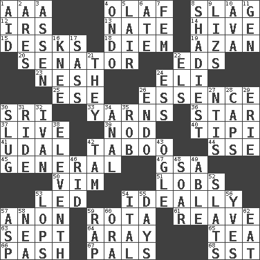 ACROSS 1. American Automobile Association (abbr.) 4. Norwegian king 8. Volcanic refuse 12. Big collection agency 13. Nathan's nickname 14. Hub of activity 15. Writing tables 18. South Vietnam president (1954) 19. Muslim summons to prayer 20. Legislator 22. Begley and Asner 23. Tender 24. Connecticut Ivy Leaguer 25. Compass dir. 26. Substance 30. Indian title of respect (Mr.) 33. Tall tales 36. Play the lead 37. Not recorded 39. Allow head to fall sleepily 40. Native american tent (variation) 41. Freehold land 42. Off limits 44. Compass dir. 45. Commissioned military rank 47. Girls' org. (abbr.) 50. Zeal 51. Tennis shots 53. Directed 54. Under perfect conditions 57. Soon (poet.) 59. Round or rotation of duties 61. Rob, plunder, or pillage 63. Back-to-school mo. 64. Like ___ of sunshine 65. Beverage made from leaves 66. Romantic infatuation 67. Friends 68. Fast jet (abbr.) DOWN 1. Assist 2. Ancient Greek god of war 3. NE Netherlands city 4. Southwest Nigerian state 5. Den 6. Had dinner 7. Opposite of masc. 8. Most dark, concealed or hidden 9. Belonging to Elizabeth 10. Actress Gardner 11. Commissioned mil. rank 16. Leg joint 17. Backtalk 21. Those things 22. Raised railways 24. Double-curved letter 26. Inside; within (prefix) 27. Nuclear Threat Initiatives 28. Balmoral and tarboosh 29. One of the Great Lakes 30. Strike heavily 31. Travel on or in a vehicle 32. "Terrible" tsar 34. Of or related to the anus 35. Director Reiner 38. Veterans Day date 42. Scottish cap 43. Stare 46. To free from 48. Fly high 49. Competent 52. Narrow boards 53. Chops off 54. Slanted text style (abbr.) 55. 24-hour periods 56. Jacques Cousteau's middle name 57. Cleo's killer 58. Teachers' org. 59. Reproach for some lapse or misdeed 60. Mouth or opening 62. Ingest