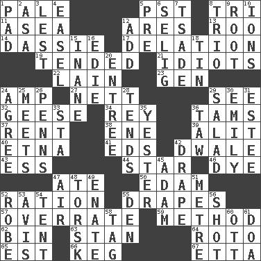ACROSS 1. Diluted with white 5. Pacific Standard Time (abbr.) 8. Three (prefix) 11. Toward the sea 12. Ancient Greek god of war 13. Friend of Pooh 14. Hyrax 17. Accusation by an informer 19. Watched over 21. Foolish or stupid persons 22. (Had) reclined 23. Commissioned military rank (abbr.) 24. Electrical Unit 27. Remaining after all deductions 29. Perceive with the eye 32. Honkers 34. Marina Del _, California 36. Scottish caps 37. Monthly bill 38. Compass dir. 39. Set down 40. Inactive volcano in Sicily 41. Begley and Asner 42. A sleeping potion; an opiate (poet.) 43. Curvy letter 44. Play the lead 46. Color 47. Had dinner 50. Dutch treat 52. Food allowance for one day 55. Window treatments 57. Make much ado about nothing 59. Mode 62. Storage container 63. Comedian Laurel of Laurel & Hardy 64. Printing process, for short 65. Eastern Standard Time (abbr.) 66. Cask 67. Singer James DOWN 1. Groovy apt. 2. White ___ sheet 3. For fear that 4. Artist's stand 5. Before (prefix) 6. Major League Baseball Commissioner Bud 7. Sadhe (variant) 8. Musical group of three 9. Carrot, for example 10. Charged atoms 12. Find the sum of 15. Empty; void 16. Singer Brickell 18. Shallow baking pan 20. Main course 24. Match 25. Confronts 26. Actor Sean's family 28. Watches over 29. First course 30. Poet Dickinson 31. First name in cosmetics 33. R.R. building 35. Of or pertaining to yesterday 36. The 23rd letter of the Hebrew alphabet 42. Window treatment 45. First man 47. Atmosphere 48. Cod relative 49. Related on the mother's side 51. Distance measurement (Brit.) 52. Loose flowing garment 53. Deliberation 54. Portable shelter 55. Lair 56. Guess 58. Label 60. Baseball player Mel 61. ___ good deed