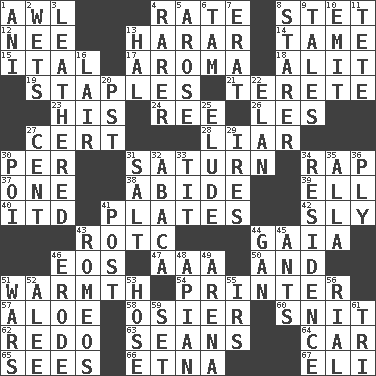ACROSS 1. Leather borer 4. Pace 8. Proofreading order 12. Born 13. Ethiopian city, capital of Harari 14. Not wild 15. Slanted text style (abbr.) 17. Odor 18. Set down 19. Paper fasteners 21. Cylindrical with tapered ends 23. Part of HMS, perhaps 24. To separate or throw off 26. French article 27. Sure thing 28. One who doesn't tell the truth 30. For each 31. Titan orbits this 34. Hit sharply and swiftly 37. Single 38. Tolerate 39. Pipe bend 40. It would 41. Food holders 42. Wily 43. College mil. group 44. Greek goddess of the earth (variant) 46. Greek goddess of the dawn 47. Auto club (abbr.) 50. Also 51. Heat 54. Hard copy producer 57. _ vera 58. Flexible twig of a willow tree 60. In a ____ (agitated or irritated) 62. Redecorate 63. Seines 64. 4-wheeled motor vehicle 65. Perceives with the eye 66. Inactive volcano in Sicily 67. Biblical high priest DOWN 1. Cuckoo 2. Moistens 3. Resembling or made to resemble leather 4. More uncommon 5. Came up 6. Scottish cap 7. Part of Q.E.F. 8. A viewer who gazes fixedly 9. Falsehoods 10. Give off 11. False hair 13. Actor Linden 16. Den 20. Pacific Standard Time (abbr.) 22. Liveliness 25. Evade 27. Penny 29. Angers 30. Luau course 31. Table seasoning 32. Phillipine bananalike plant 33. Teat (slang) 34. Dwelling 35. Silent film actress Nazimova 36. Apply oneself diligently 41. Mail 43. Lover boys 44. Separate the seeds from cotton 45. Pismires 46. Eat (away) 48. Bee-related 49. Sports stadium 51. Armed conflicts 52. Toward shelter 53. Stockings 55. Big collection agency 56. Monetary unit of Yemen 59. Arrange properly for use 61. Three (prefix)