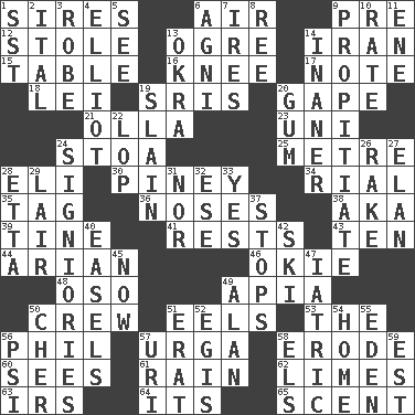 ACROSS 1. Male parents of animals 6. Wind 9. Before (prefix) 12. Fur scarf 13. Legendary monster 14. SW Asia republic 15. Eating place 16. Leg joint 17. Short letter 18. Flowery wreath 19. Indian titles of respect 20. Open wide 21. Spanish pot 23. Single; one (prefix) 24. Portico 25. Distance measurement (Brit.) 28. Connecticut Ivy Leaguer 30. Abounding in pines 34. Monetary unit of Yemen 35. Label 36. Olfactory organs 38. Alias (abbr.) 39. Prong on a fork 41. Musical pauses 43. "___ Little Indians" 44. Believer in; advocate of (suffix) 46. Migrant worker of the '30s 48. Bear (Spanish) 49. Capital of Western Samoa 50. Group working together 51. Snakelike fish 53. Definite Article 56. Silvers or Donahue 57. Capital and largest city of Mongolia 58. Eat (away) 60. Observes 61. Water falling in drops from the sky 62. Citrus fruits 63. Big collection agency 64. ___ a Wonderful Life 65. Odor DOWN 1. Fast jet (abbr.) 2. Slanted text style (abbr.) 3. Loose flowing garment 4. American author Paul (1891-1958) 5. Observe 6. Hindu god of fire 7. Angers 8. Portuguese money of account (variant) 9. Conciliate 10. Pace 11. Compass dir. 13. Gumbo ingredient 14. More lacking in sense or substance 19. Killed 20. Chewing product 22. Chop off 24. Seigniories (variant) 26. Immoral or dissolute person 27. Liveliness 28. Singer James 29. Den 31. Not either 32. Compass dir. 33. It is so 37. Closes up, plugs up 40. Artist's stands 42. What Jean-Claude Killy likes to do 45. Immediately 47. Of or pertaining to medicine 49. ____ Jay Lerner 50. "Mermaids" star 51. Part of Q.E.F. 52. The front part of a cuirass 54. Dwelling 55. Locale of original sin 56. 23rd letter of the Greek alphabet 57. RI univ. 58. Raised railways 59. Eastern Standard Time (abbr.)