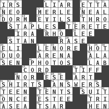 ACROSS 1. Big collection agency 4. One who doesn't tell the truth 8. Singer James 12. Modern: prefix 13. Haggard of country music 14. Be tempered by heat 15. Dormintory (informal) 17. Vices 18. Through, poetically 19. Paper fasteners 21. Cylindrical with tapered ends 23. Lyricist Gershwin 24. 17th letter of the Greek alphabet 26. Area sheltered from the wind 27. Comedian Laurel of Laurel & Hardy 28. Raze (variant) 30. Connecticut Ivy Leaguer 31. Poe poem 34. Being at a high temperature 37. Superhero pair 38. Sports stadium 39. Insect wing 40. Elected rep. 41. Pictures 42. Experiment locale 43. Drawstring 44. Small quarrel 46. And not 47. Compass dir. 50. Tate display 51. Upper-body garments 54. Replies (to) 57. Adolescent 58. Portable shelters 60. Set of matching outer garments 62. At one time in the past 63. First name in cosmetics 64. Three (prefix) 65. Toward the sea 66. Russian ruler of old 67. Layer DOWN 1. Indiana (abbr.) 2. Vintage cars 3. Decision 4. Crowbar 5. From or relating to Ireland 6. Everything 7. State of inaction 8. Main course 9. Giggle 10. Small pie 11. Medicinal plant 13. Cartoonist voice _ Blanc 16. Hindu Mythology: god of death 20. Baking dish 22. Otherwise 25. U. of Maine site 27. Turn sharply 29. Ancient river in northeast Turkey 30. Begley and Asner 31. Cowardly lion portrayer 32. Eat (away) 33. Fish or hair follower 34. Not exactly gospel 35. Norwegian king 36. Bar bill 41. Left side of a ship or aircraft 43. Pupil covering 44. The 23rd letter of the Hebrew alphabet 45. Angers 46. Sibling's daughter 48. Before Barbara or Clara 49. Keyboard key 51. Portico 52. Coop moms 53. Proofreading order 55. Compass dir. 56. The founder of a family 59. Curvy letter 61. Metal container