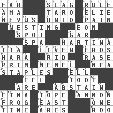 ACROSS 1. Distant 4. Volcanic refuse 8. General guideline 12. Wet nurse (var.) 13. Pacific island yam 14. Writer Wiesel 15. Mole, birthmark 18. To (old English) 19. Ache 20. Nestling 22. Age 23. Blemish 24. Slender fish 25. Health resort 26. Chrissie's court nemesis 30. Call ___ day 33. Make or become more lively 36. Greek god of love 37. Hindu Mythology: god of death 39. To free from 40. Raze (variant) 41. Demure 42. Klaipeda city 44. Teachers' org. 45. Paper fasteners 47. Pipe bend 50. Snakelike fish 51. A blast of a horn 53. "We ___ not amused" (Victoria) 54. Choose not to consume 57. Inactive volcano in Sicily 59. Drink excessively 61. ID or VA city 63. Tree-dwelling hopper 64. Compass direction 65. Single 66. Prong on a fork 67. Ancient Greek god of war 68. Friend of Pooh DOWN 1. Air blower 2. So be it 3. All-night dance parties 4. Make senseless or dizzy 5. Austrian-born American filmmaker Fritz 6. Nonscientific branch of learning 7. Thick or sticky substance 8. News announcer 9. ____ Bator 10. Cards in a Roman deck? 11. Car or cant ending 16. United States Postal Service (abbr.) 17. Halt 21. Slanted text style (abbr.) 22. Ewer handle 24. Separate the seeds from cotton 26. Ancient Persian 27. SW Asia republic 28. Characteristic smell of wine 29. Toward the sea 30. Naughty children 31. Small pie 32. Operatic vocal solo 34. Angers 35. Zeal 38. Electrical Measurement 42. Cartoonist voice _ Blanc 43. Allows 46. Area sheltered from the wind 48. Globular water bottle used in Asia 49. Rich soil 52. Southeast Indonesia island 53. At once, immediately (arch.) 54. Domed church section 55. Stakes 56. Words to Nanette 57. Newt 58. Three (prefix) 59. Beverage made from leaves 60. Boat paddle 62. Modern: prefix