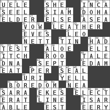 ACROSS 1. Ubangi River tributary 5. A female animal or person 8. South American Indian 12. Stitch closed the eyes of (a falcon) 13. Thailand, formerly 15. Capital of the state of Qatar 16. A person who is older than you are 18. Otherwise 19. Toward the sea 20. Promise 22. Cordwainer's material 24. Nights before holidays 26. Lion 27. Remaining after all deductions 28. Shallow baking pan 29. Possessed 32. Trial 35. _ vera 37. Biblical high priest 38. Hankering 39. Friend of Pooh 40. Lie 41. Heredity factor (abbr.) 42. Back-to-school mo. 43. Dutch treat 44. Ingest 45. For each 46. Lick closed 49. RI univ. 50. Shout 51. Mood resulting from idleness 55. Teachers' org. 56. "Two Mules for Sister ____" 57. Supplements with great effort 59. Choose 63. Part of Q.E.F. 64. Actor's bit 65. Austrian river, tributary to the Danube 66. Competent 67. Eastern Standard Time (abbr.) 68. Suggestive of the supernatural DOWN 1. Purpose 2. Snakelike fish 3. Directed 4. Veterans Day date 5. Compass dir. 6. Land elevation 7. Relaxation 8. Potato state 9. Sense of smell 10. "Mermaids" star 11. American Automobile Association (abbr.) 14. Ear of corn 17. Be footloose 21. Dripping 23. Nine, plus one 25. A viewer who gazes fixedly 28. A girl or young woman (variant) 29. Froth on beer 30. Silent film actress Nazimova 31. South Vietnam president (1954) 32. Event that recurs at intervals 33. Inactive volcano in Sicily 34. Get outta here! 36. Trim (branches) 40. Copy Pinocchio 42. Beer mug 45. Before (prefix) 47. Car or cant ending 48. Toward shelter 49. A salt of uric acid 51. Sharp remark 52. Taken by mouth 53. Migrant worker of the '30s 54. Not women's 56. Ocean 58. Put into a specified state 60. Compass dir. 61. Auto 62. Attempt to accomplish something