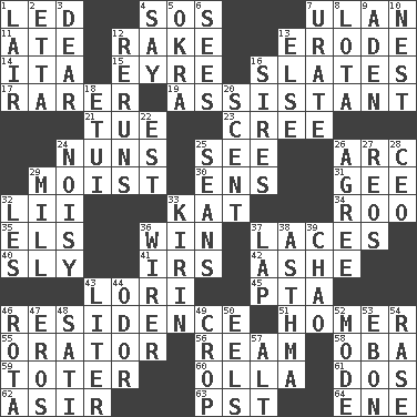 ACROSS 1. Directed 4. Distress signal 7. ____ Bator, Mongolia 11. Had dinner 12. Libertine 13. Eat (away) 14. Call ___ day 15. Jane of fiction 16. Chalkboards 17. More uncommon 19. Aide 21. Third day of the wk. 23. Algonquian 24. Religious women 25. Perceive with the eye 26. Curve 29. Wet 30. Followers of ems 31. Unit of force equal to gravity 32. Cards in a Roman deck? 33. Krazy ___ of comics 34. Friend of Pooh 35. Raised railways 36. Victory 37. Shoestrings 40. Stealthy 41. Big collection agency 42. American tennis player Robert 43. Australian parrot (variant) 45. Parent Teacher Association (abbr.) 46. Dwelling 51. Homing pigeon 55. Speaker 56. 480, 500 or 516 sheets of paper 58. Chief or king in Benin or Nigeria 59. Carrier 60. Spanish pot 61. Two (Sp.) 62. SW Saudi Arabia district 63. Pacific Standard Time (abbr.) 64. Compass dir. DOWN 1. Den 2. Singer James 3. Letter starter 4. Declare 5. Gumbo ingredient 6. Observes 7. A salt of uric acid 8. Globular water bottle used in Asia 9. An important port of Yemen 10. A home for chicks 12. Summer TV shows 13. Otherwise 16. Begets 18. Needle case 20. Odor 22. Eastern Standard Time (abbr.) 24. Annoyingly loud 25. Seines 26. Match 27. Vintage cars 28. Corporate head (abbr.) 29. Place where flour is made 32. French article 33. Japanese brewing company 36. One who wires 37. Infant locale 38. Respiratory problem 39. US Secretary of Labor Elaine L. _ 43. 61 cubic inches 44. Aroma 46. Roll call or roster of names 47. Greek god of love 48. Suttee (variant) 49. Riding implement 50. Snakelike fish 52. Method 53. Inky black, to poets 54. To erase 57. Keyboard modifier key