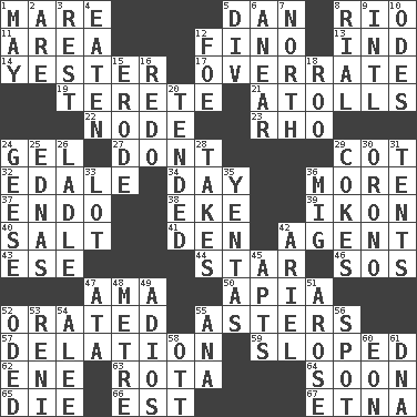 ACROSS 1. Female horse 5. One of the 12 tribes of Israel 8. River (Sp.) 11. Length times width 12. Fine (Spanish) 13. Working for oneself (abbr.) 14. Last 17. Make much ado about nothing 19. Cigar-shaped 21. Ringlike coral islands and reefs 22. Connecting point 23. 17th letter of the Greek alphabet 24. Set 27. Do not 29. Small bed 32. Peak District village in England 34. 24 hours 36. Greater amount 37. Inside; within (prefix) 38. Supplement with great effort 39. Picture 40. Table seasoning 41. Lair 42. Rep 43. Compass dir. 44. Play the lead 46. Mayday 47. Nursemaid (var.) 50. Capital of Western Samoa 52. Declaimed 55. Michaelmas daisies 57. Accusation by an informer 59. Inclined 62. Compass dir. 63. Round or rotation of duties 64. Within a short period 65. Pass on 66. Eastern Standard Time (abbr.) 67. Inactive volcano in Sicily DOWN 1. Can I? 2. "We ___ not amused" (Victoria) 3. Repose 4. Eroded 5. HTML Container Element 6. Approach 7. Compass direction 8. Monetary unit of Yemen 9. International (abbr.) 10. Lyric poems 12. Enemy 15. Eat (away) 16. Redecorate 18. Friend of Pooh 20. Watched over 24. Honkers 25. Ferber et al. 26. Dipping utensil 28. Proceeds 29. Popular sodas 30. U. of Maine site 31. Portable shelters 33. Car dealer's back yard 35. Gossips 36. Russian fighter aircraft 42. Satellite of Uranus 45. Flats, for short 47. _ moment's notice (2 wds.) 48. Distance measurement (Brit.) 49. Goodbye (Sp.) 51. Came up 52. Wrote a lyric poem 53. Painter Guido (1575-1642) 54. Toward shelter 55. Santa ___, CA 56. Specific locale 58. Baseball player Mel 60. Age 61. Heredity factor (abbr.)