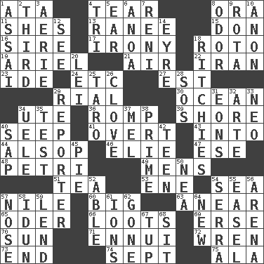 ACROSS 1. _ moment's notice (2 wds.) 4. Pull apart 8. Mouth or opening 11. "______ My Girl" (Turtles hit) 13. Indian princess (variant) 15. Spanish title 16. Male parent of an animal 17. Literary sarcasm 18. Printing process, for short 19. Satellite of Uranus 21. Wind 22. SW Asia republic 23. Binary compound 24. And so on (abbr.) 27. Eastern Standard Time (abbr.) 29. Monetary unit of Yemen 30. Sea 34. Shoshoni 36. Frolic 39. Dinah or Pauly 40. Ooze 41. Unconcealed 43. To the inside or interior of 44. Columnist Joseph or Stewart 46. Writer Wiesel 47. Compass dir. 48. _ dish (used to culture cells) 49. Not women's 51. Beverage made from leaves 53. Compass dir. 54. Ocean 57. The longest river in the world 60. Massive 63. Approach 65. Baltic tributary 66. Plunders 69. Celtic language 70. Player for Phoenix 71. World-weariness 72. Songbird 73. Conclude 74. Back-to-school mo. 75. Chicken ___ king DOWN 1. Slender Brazilian palm 2. One of three equal parts 3. Nest on high 4. Three (prefix) 5. Hearing organ 6. Small Philippine buffalo 7. Painter Guido (1575-1642) 8. Aroma 9. Round or rotation of duties 10. Soon (poet.) 12. Perceive with the eye 14. Jane of fiction 18. Actors Guy, Robert Welles, and Clint 20. Flowery wreath 25. Edible starchy tuberous root 26. Garlic unit 28. Mayday 29. Newsperson 31. Immeasurably long periods of time 32. Johnson of "Laugh-In" 33. Modern: prefix 34. Ubangi River tributary 35. Trial 37. Cartoonist voice _ Blanc 38. First class 40. Plant excrement 42. Adolescent 45. Sliced dessert 50. Teachers' org. 52. Competent 54. Spanish missionary in California 55. Artist's stand 56. Sports stadium 57. Olfactory organ 58. Goddess of spring and wife of Bragi 59. Grant temporary use of 61. Charged atoms 62. Went 64. ___ Haven, CT 67. Uncastrated adult male sheep 68. Be seated