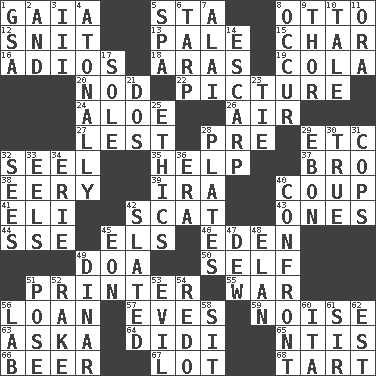 ACROSS 1. Greek goddess of the earth (variant) 5. R.R. building 8. Von Bismarck 12. In a ____ (agitated or irritated) 13. Light colored 15. Burn to charcoal 16. Goodbye (Sp.) 18. Caspian sea tributary 19. Root beer relative 20. Dreamland 22. Photo 24. _ vera 26. Atmosphere 27. For fear that 28. Before (prefix) 29. And so on (abbr.) 32. Stitch closed the eyes of (a falcon) 35. Aid 37. Sis' sibling 38. Suggestive of the supernatural 39. Retirement account (abbr.) 40. Overturn; upset 41. Biblical high priest 42. Go away! 43. Singles 44. Compass dir. 45. Raised railways 46. Locale of original sin 49. ___ good deed 50. Itself 51. Hard copy producer 55. Armed conflict 56. Grant temporary use of 57. Nights before holidays 59. Annoying sound 63. "____ silly question..." 64. "You Light Up My Life" star Conn 65. Nuclear Threat Initiatives 66. Fermented drink made from hops 67. Car dealer's back yard 68. Small pie DOWN 1. Girls' org. (abbr.) 2. Plus 3. One more than two 4. Lacking a tonal center or key 5. Health resort 6. Canvas cover 7. Jai _ 8. Come to pass 9. Son of Odin 10. Falsehood 11. Mouth or opening 14. Fortification 17. Flatfish 21. Two (Sp.) 23. Standoff 25. Principles of right and wrong 28. Food holders 29. Inky black, to poets 30. Loyal 31. 911 reaches them 32. Perceives with the eye 33. Snakelike fish 34. 4th largest of the Great Lakes 36. Epoch 40. Meet 42. Scheduled 45. A really long time 47. Morning condensation 48. Flair 49. Middle Eastern gold or silver currency 51. Introduce or present, as a question 52. Immoral or dissolute person 53. Morally bad or wrong 54. Do over again 56. Experiment locale 58. Be seated 60. Call ___ day 61. Title for a knight 62. Eastern Standard Time (abbr.)