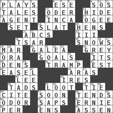 ACROSS 1. Romps 6. Compass dir. 9. Distress signal 12. Falsehoods 13. River in Europe 14. Flintstone garb 15. Rep 16. South American Indian 17. Double curve, resembling the letter S 18. Put into a specified state 19. Narrow board 20. Coop moms 21. Lettered men learn these first 23. One more than two 24. Russian ruler of old 25. Overwhelms 28. Third mo. 30. An organ shaped like a helmet 34. Jennifer or Joel 35. Mouth or opening 36. Scores awarded for successful feats 38. ___ a Wonderful Life 39. Hiding places for outlaws 41. _____ steamer (cargo ship) 43. Eastern Standard Time (abbr.) 44. Artist's stand 46. Caspian sea tributary 48. Area sheltered from the wind 49. Angers 50. Small amounts or degrees 51. Spoils 53. Neckwear 56. Quote 57. Within a short period 58. Looks after 60. Aroma 61. Plant excrements 62. Bert's buddy 63. For each 64. Followers of ems 65. NE Netherlands city DOWN 1. Parent Teacher Association (abbr.) 2. Falls behind 3. Toward shelter 4. Gossips 5. Fast jet (abbr.) 6. Pulitzer Prize-winning author Ferber 7. Religious group 8. Epoch 9. Seigniories (variant) 10. Lyric poems 11. Perceive with the eye 13. Lubricates 14. Cultivating 19. Lean end of the neck 20. Part of HMS, perhaps 22. Container for groceries 24. Interpreter 26. Soaks 27. System (abbr.) 28. Method 29. Type of rug 31. Car dealer's back yard 32. Hearing organ 33. Wing 37. Don Adams' spy role 40. Sowing specialist 42. Before (prefix) 45. French article 47. Michaelmas daisies 49. Charged atoms 50. Periodic rise and fall of the sea level 51. Grant temporary use of 52. I made a mistake 54. Taverns 55. Singer Brickell 56. Police officer (slang) 57. Compass dir. 58. Afternoon social gathering 59. Elected rep.