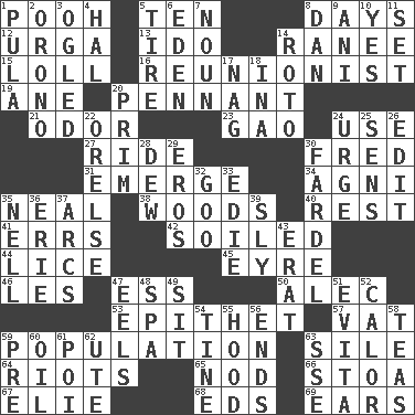 ACROSS 1. "Silly old bear" 5. Nine, plus one 8. 24-hour periods 12. Capital and largest city of Mongolia 13. Wedding promise 14. Indian princess (variant) 15. Hang loosely or laxly 16. One who advocates reunion 19. One (Scot) 20. Pre-World Series prize 21. Scent 23. E Mali city 24. Purpose 27. Travel on an animal 30. Flintstone 31. Develop 34. Hindu god of fire 35. Actress Patricia 38. Forest 40. State of inaction 41. Blunders 42. Dirtied 44. Louse (plural) 45. Jane of fiction 46. French article 47. Double-curved letter 50. Actor Baldwin 53. Curse 57. Large container 59. Census information 63. Filth; sediment 64. Debaucheries 65. Allow head to fall sleepily 66. Portico 67. Writer Wiesel 68. Begley and Asner 69. Hearing organs DOWN 1. Monetary unit of Botswana 2. U. of Maine site 3. Stared at amorously 4. Actor Linden 5. Hoop that covers a wheel 6. Genesis locale 7. Part of speech 8. One of the 12 tribes of Israel 9. Black tropical American cuckoo 10. Consenting reply 11. Arrange properly for use 14. Printing process, for short 17. Tired old horse 18. _ tizzy (2 wds.) 20. Demure 22. Threatening words 24. Goad 25. Elected reps. 26. Prepare for publication 28. Morning condensation 29. Greek god of love 30. Pack 32. Thick or sticky substance 33. Singer Brickell 35. 1994 drama film starring Jodie Foster 36. One of the Great Lakes 37. Arches 39. Mischievous 43. Part of Q.E.F. 47. Snakelike fish 48. Health resort 49. Be seated 51. Webber/Rice musical 52. Bodily heat indicating an inflammation 54. Prong on a fork 55. Parka part 56. Conclusions 58. Beverages made from leaves 59. Before (prefix) 60. Petroleum 61. Luau course 62. Shoshoni 63. Compass dir.