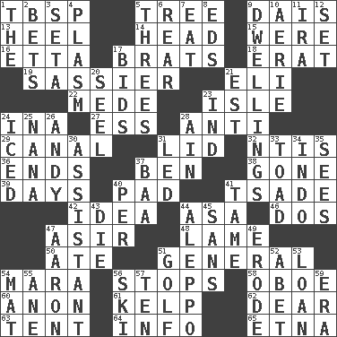 ACROSS 1. Cook's measure (abbr.) 5. Woody plant 9. Raised platform 13. Person who is morally reprehensible 14. Froth on beer 15. Past tense of be (plural) 16. Singer James 17. Naughty children 18. Part of Q.E.F. 19. More lively and spirited 21. Biblical high priest 22. Ancient Persian 23. Capri or Wright 24. _ tizzy (2 wds.) 27. Curvy letter 28. Opposed to 29. Lessep's creation 31. Hat (slang) 32. Nuclear Threat Initiatives 36. Extremities 37. Benjamin's nick name 38. Went 39. 24-hour periods 40. Groovy apt. 41. Sadhe (variant) 42. The content of cognition 44. White ___ sheet 46. Two (Sp.) 47. SW Saudi Arabia district 48. Unable to walk 50. Had dinner 51. Commissioned military rank 54. Hindu Mythology: god of death 56. Closes up, plugs up 58. Mitch Miller's instrument 60. At once, immediately (arch.) 61. Seaweed 62. Letter starter 63. Portable shelter 64. A message received and understood 65. Inactive volcano in Sicily DOWN 1. Definite Article 2. Stakes 3. Stalk of a moss capsule 4. Suffix with ecto or cyto 5. Triplets 6. Rump 7. Consume 8. Begley and Asner 9. Homes 10. Nest on high 11. Lyricist Gershwin 12. Arrange properly for use 17. Auction offers 20. Sew up the eyelids of hawks and falcons 21. Eastern Standard Time (abbr.) 23. Indiana (abbr.) 24. On the rocks 25. Grandmother 26. "60 Minutes" Commentator Rooney 28. The 18th letter of the Arabic alphabet 30. Helper 31. Directed 33. Frog relative 34. _ china 35. Observes 37. Sound made by sheep 40. For each 41. Not wild 43. Expire 44. City in Syria 45. Without 47. Composer Copland 49. Wear away 51. _ course 52. Collude with 53. Grant temporary use of 54. Floor protector 55. A saturated hydrocarbon 56. What Jean-Claude Killy likes to do 57. "___ Little Indians" 59. Epoch