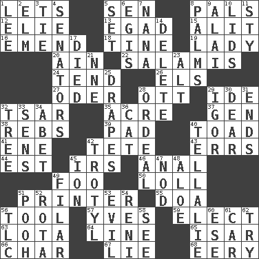ACROSS 1. Allows 5. Elected rep. 8. Friends 12. Writer Wiesel 13. Mild oath 15. Set down 16. Make improvements or corrections to 18. Prong on a fork 19. Kenny Rogers chart-topper in '80 20. The 18th letter of the Arabic alphabet 22. Deli grouping 24. Watch over 26. Raised railways 27. Baltic tributary 28. Baseball player Mel 29. Binary compound 32. Russian ruler of old 35. 1/640 square mile 37. Commissioned military rank (abbr.) 38. Confederate soldiers (slang) 39. Groovy apt. 40. Frog relative 41. Compass dir. 42. False hair 43. Blunders 44. Eastern Standard Time (abbr.) 45. Big collection agency 46. Of or related to the anus 49. Egg _ yung 50. Hang loosely or laxly 51. Hard copy producer 55. ___ good deed 56. Implement 57. Jacques Cousteau's middle name 59. Opt 63. Globular water bottle used in Asia 64. Actor's bit 65. Austrian river, tributary to the Danube 66. Burn to charcoal 67. Untruth 68. Suggestive of the supernatural DOWN 1. Area sheltered from the wind 2. Shade tree 3. Make a knot 4. Elected representatives 5. Arrange properly for use 6. The front part of a cuirass 7. Grandmother 8. Insides of hands 9. Jai _ 10. Flaplike coverings 11. Filthy place 14. Keyboard key 17. Passed on 21. Compass dir. 23. The first octave above the treble staff 25. Window treatments 28. Severe or trying experience 29. Composer Stravinsky 30. Letter starter 31. Conclusions 32. Relationship diagram 33. Elected reps. 34. Collude with 36. Feline 40. Copy Pinocchio 42. TNT 45. Electrically charged atom 47. Dreamland 48. Medicinal plant 49. Having threads 51. "Silly old bear" 52. Roll call or roster of names 53. Tending to cause great harm 54. Painter Guido (1575-1642) 56. Affectionate concern, for short 58. Perceive with the eye 60. Compass dir. 61. 4-wheeled motor vehicle 62. Attempt