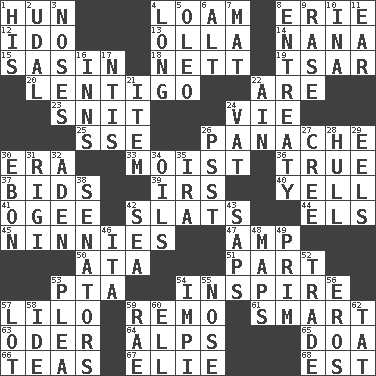 ACROSS 1. Attila the _ 4. Rich soil 8. One of the Great Lakes 12. Wedding promise 13. Rounded earthenware pot or jar 14. Grandmother 15. Indian antelope 18. Remaining after all deductions 19. Russian ruler of old 20. Small, flat, pigmented spot on the skin 22. "We ___ not amused" (Victoria) 23. In a ____ (agitated or irritated) 24. Compete 25. Compass dir. 26. Flamboyance 30. Epoch 33. Wet 36. Loyal 37. Auction offers 39. Big collection agency 40. Shout 41. Double curve, resembling the letter S 42. Narrow boards 44. Raised railways 45. Simpletons 47. Electrical Unit 50. "One Day ___ Time" 51. Role in a play 53. Parent Teacher Assoc. 54. Heighten or intensify 57. _ and Stitch 59. San ____ (Riviera town) 61. Don Adams' spy role 63. Baltic tributary 64. High mountains 65. ___ good deed 66. Afternoon social gatherings 67. Writer Wiesel 68. Eastern Standard Time (abbr.) DOWN 1. Part of HMS, perhaps 2. Hereditary estate 3. Olfactory organs 4. Having great length 5. Margarine 6. The first octave above the treble staff 7. Floor covering 8. Plea 9. To erase 10. _ tizzy (2 wds.) 11. Ewer handle 16. Restaurants 17. Nuclear Threat Initiatives 21. Detail 22. The 18th letter of the Arabic alphabet 24. Large container 26. Inconspicuous attention getter 27. Algonquian 28. Frame or body of a ship 29. Snakelike fish 30. Inky black, to poets 31. Swiss mountan, "Queen of the Mountains" 32. Arabian gulf 34. Petroleums 35. Lyricist Gershwin 38. Legislators 42. Ocean 43. Plant excrements 46. Call ___ day 48. Atlas contents 49. Demure 52. Buy and sell 53. Entreaty 54. Body of Kaffir warriors 55. Olfactory organ 56. Greek god of love 57. Car dealer's back yard 58. Binary compound 59. Actress Charlotte 60. Pipe bend 62. Make lace