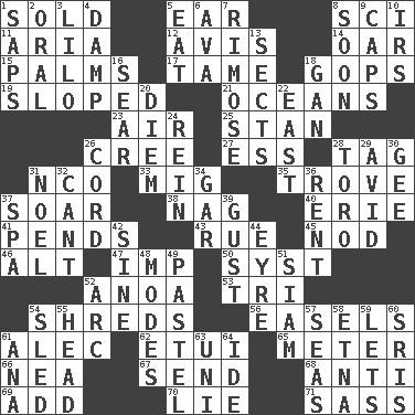 ACROSS 1. Exchanged or delivered for money 5. Ewer handle 8. _-fi 11. Operatic vocal solo 12. Opinion 14. Rowing implement 15. Insides of hands 17. Docile 18. Republicans 19. Had an oblique or slanted direction 21. Seas 23. Wind 25. Comedian Laurel of Laurel & Hardy 26. Algonquian 27. Curvy letter 28. Label 31. Non-commissioned officer (abbr.) 33. Russian fighter aircraft 35. Collection of objects 37. Fly high 38. Tired old horse 40. One of the Great Lakes 41. Depends 43. Sorrow 45. Allow head to fall sleepily 46. Keyboard modifier key 47. Mischievous child 50. System (abbr.) 52. Small Philippine buffalo 53. Three (prefix) 54. Tears up 56. Artist's stands 61. Actor Baldwin 62. Needle holder 65. Distance measurement 66. Teachers' org. 67. Post 68. Against 69. Increase 70. Whopper 71. Backtalk DOWN 1. Plant excrements 2. Spoken 3. _ and Stitch 4. Moist 5. Erode 6. Actress Gardner 7. Full of chinks, cracks, or crevices 8. Within a short period 9. Balmoral and tarboosh 10. Big collection agency 13. Religious groups 16. Singe 18. Separate the seeds from cotton 20. South Vietnam president (1954) 22. Compass direction 24. It's straight from the horse's mouth 26. Drawstring 28. "Corrida" creature 29. Enthusiastic 30. Turn to the right 31. Christmas carol 32. Patter 34. Slender fish 36. Monthly bill 37. Health resort 39. Abrupt rush of wind 42. Trig term 44. Jane of fiction 48. Methods 49. Soft color 51. Thailand, formerly 52. Curve 54. Downhill vehicle 55. Froth on beer 57. Oceans 58. Inactive volcano in Sicily 59. Allows 60. Indian titles of respect 61. Santa ___, CA 63. University (slang) 64. Binary compound
