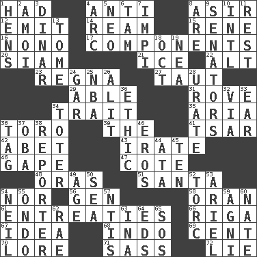 ACROSS 1. Possessed 4. Opposed to 8. SW Saudi Arabia district 12. Give off 14. 480, 500 or 516 sheets of paper 15. French philosopher Descartes 16. Words to Nanette 17. Pieces 20. Thailand, formerly 21. Frozen water 22. The first octave above the treble staff 23. Rain (Swedish) 27. Pulled tight 29. Competent 31. Be footloose 34. Distinguishing feature 35. Operatic vocal solo 36. "Corrida" creature 39. Definite Article 41. Russian ruler of old 42. Collude with 43. Feeling or showing extreme anger 46. Open wide 47. ____ d'Azur (French Riviera) 48. Mouths or openings 51. Before Barbara or Clara 54. Or not 56. Commissioned military rank (abbr.) 58. NW Algerian seaport 61. Pleas 66. Port city in Latvia 67. It may be bright or harebrained 68. Southeast Asian peninsula 69. Penny 70. Old wives' tales, e.g. 71. Backtalk 72. Whopper DOWN 1. Coop moms 2. Mine, in Marseilles 3. Middle Eastern gold or silver currency 4. Curve 5. Modern: prefix 6. Scottish cap 7. Body of Kaffir warriors 8. "We ___ not amused" (Victoria) 9. Legislators 10. International (abbr.) 11. Remainder 13. Heavy book 18. Sep. follower 19. Teachers' org. 24. Slender fish 25. Basketball assoc. 26. Came down and settled, as after flight 28. A salt of uric acid 30. Principle of right and wrong 32. By way of 33. Ewer handle 34. Carrier 36. Label 37. Chief or king in Benin or Nigeria 38. News announcer 40. Greek god of love 44. _ moment's notice (2 wds.) 45. "___ Little Indians" 49. Ripen 50. Ocean 52. Torque (variant) 53. Satellite of Uranus 54. Famous astronaut Armstrong 55. Southwest Nigerian state 57. Nuclear Threat Initiatives 59. Hindu god of fire 60. Nathan's nickname 62. Actress Charlotte 63. _ tizzy (2 wds.) 64. Begley and Asner 65. Distress signal