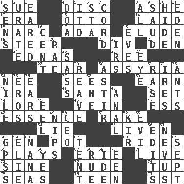 ACROSS 1. Institute legal proceedings 4. Compact _ 8. American tennis player Robert 12. Epoch 13. Von Bismarck 14. Put down 15. Drug cop 17. The sixth month of the Jewish calendar 18. Dodge 19. Guide 21. HTML Container Element 23. Lair 24. Ferber et al. 26. Portuguese money of account (variant) 28. Lacerate 30. Nineveh was its capital 34. Born 37. Observes 39. Merit 40. Lyricist Gershwin 41. Before Barbara or Clara 43. Put into a specified state 44. Old wives' tales, e.g. 46. Distinctive style or manner 47. Double-curved letter 48. Substance 51. Immoral or dissolute person 54. Whopper 55. Make or become more lively 58. Commissioned military rank (abbr.) 61. Plant holder 63. Amusement-park features 65. Frolics 67. One of the Great Lakes 71. Moving, as bait 72. Trig term 73. Unadorned 74. Uncastrated adult male sheep 75. Oceans 76. Adolescent 77. Fast jet (abbr.) DOWN 1. Elected reps. 2. A salt of uric acid 3. Having ears or earlike features 4. ___ good deed 5. It would 6. R.R. building 7. Drawstring 8. Everything 9. Saudi Arabian king (1953-1964) 10. Flintstone garb 11. Paradise 16. Penny 18. Nights before holidays 20. Actress Charlotte 22. Big collection agency 25. Backtalk 27. Sight organ 29. Break or tear apart 30. Moving about 31. To erase 32. Angers 33. Pismires 34. The longest river in the world 35. Greek god of love 36. Hearing organs 38. Compass dir. 42. Of or related to the anus 45. Snakelike fish 49. Pinches, bites 50. Corporate head (abbr.) 52. Apertif with cassis 53. Morally bad or wrong 56. Prepares for publication 57. Congenital growth or mark on the skin 58. Global Positioning Systems (abbr.) 59. Writer Wiesel 60. Nanny 62. Portable shelter 64. Back-to-school mo. 66. Affirmative reply 68. Regret 69. Binary compound 70. Car or cant ending