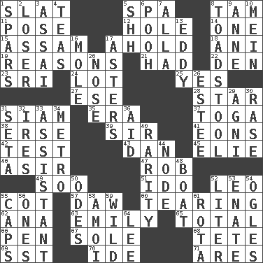 ACROSS 1. Narrow board 5. Health resort 8. Scottish cap 11. Introduce or present, as a question 12. Opening into or through something 14. Single 15. Indian state 17. Hold, grip (Informal) 18. Cuckoo 19. Thinks logically 21. Possessed 22. Lair 23. Indian title of respect (Mr.) 24. Car dealer's back yard 25. Consenting reply 27. Compass dir. 28. Play the lead 31. Thailand, formerly 35. Period 37. Ancient Roman robe 38. Celtic language 39. Title for a knight 41. Immeasurably long periods of time 42. Trial 43. Daniel's nick name 45. Writer Wiesel 46. SW Saudi Arabia district 47. Director Reiner 49. "Barney Miller" actor Jack 51. Wedding promise 52. Lion 55. Small bed 57. Fool 60. Lacerating 62. Santa ___, CA 63. Poet Dickinson 65. Add up to 66. Animal enclosure 67. Not divided or shared with others 68. False hair 69. Fast jet (abbr.) 70. Binary compound 71. Ancient Greek god of war DOWN 1. Practice fights 2. Failure 3. Slender Brazilian palm 4. Afternoon social gatherings 5. Quiet! 6. "Silly old bear" 7. Silent film actress Nazimova 8. Inedible or poisonous agaric 9. Queen of England 1702-14 10. Count _ (2 wds.) 13. Whirlpool 16. Undercover agent 17. Michaelmas daisies 20. Olfactory organ 26. First name in cosmetics 29. Hindu god of fire 30. To erase 31. Stalk of a moss capsule 32. Angers 33. Helper 34. Paris' subway 36. Help 40. Noteworthy scarcity 44. Connecting point 48. Water vessel 50. Lyric poems 52. 61 cubic inches 53. Related on the mother's side 54. Stares at amorously 55. Smile enhancers 56. Washington bills 58. Mine, in Marseilles 59. Uncontrolled 61. Roll call or roster of names 64. Area sheltered from the wind