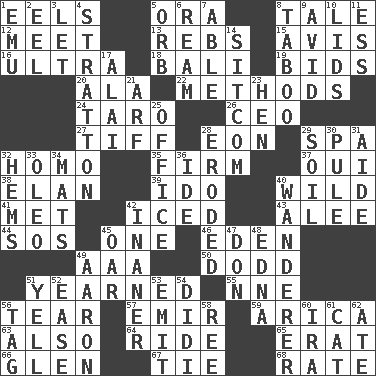 ACROSS 1. Snakelike fish 5. Mouth or opening 8. Story 12. Rendezvous 13. Confederate soldiers (slang) 15. Deliberation 16. Extreme 18. Indonesian resort city 19. Auction offers 20. Chicken ___ king 22. Modes 24. Edible starchy tuberous root 26. Corporate head (abbr.) 27. Small quarrel 28. Period of immesurable duration 29. Health resort 32. Like (prefix) 35. Become taut 37. Fr. "Yes" 38. Flair 39. Wedding promise 40. Rampant 41. Was introduced to 42. On the rocks 43. Toward shelter 44. Mayday 45. Single 46. Locale of original sin 49. Auto club (abbr.) 50. Texas town _ City 51. Had a strong desire 55. Compass dir. 56. Rend 57. Arab leader 59. N. Chile seaport 63. In addition 64. Travel on an animal 65. Part of Q.E.F. 66. Small, secluded valley 67. Neckwear 68. Pace DOWN 1. Australian flightless bird 2. Snakelike fish 3. Allow 4. Ski resort town in Vermont 5. Globe 6. 480, 500 or 516 sheets of paper 7. Competent 8. Off limits 9. Enthusiastic 10. Hats (slang) 11. Curvy letter 14. "Cheers" or "Ellen" 17. Jai _ 21. Sandy's bark 23. Layer 25. Position of authority 28. Eaten away 29. Land 30. Whimper 31. Helper 32. Equivocates 33. Butter sub 34. Floor coverings 36. Binary compound 40. Nomad 42. More empty; more void 45. Rowing implement 47. Spanish title 48. Pulitzer Prize-winning author Ferber 49. Composer Copland 51. Shout 52. Comfort 53. Send forth 54. "You Light Up My Life" star Conn 56. Label 58. To separate or throw off 60. Lyricist Gershwin 61. Domesticated feline 62. Had dinner