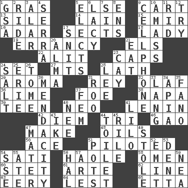 ACROSS 1. Pate de foie ____ 5. Otherwise 9. Heavy open wagon 13. Drop; flow; fall 14. (Had) reclined 15. Independent ruler or chieftain 16. The sixth month of the Jewish calendar 17. Religious groups 18. Kenny Rogers chart-topper in '80 19. Tendancy to err 21. Raised railways 22. Came down and settled, as after flight 23. Balmoral and tarboosh 24. Put into a specified state 27. Mountains (abbr.) 28. Thin strip of wood or metal 29. Odor 31. Marina Del _, California 32. Norwegian king 36. Welles in "The Third Man" 37. Enemy 38. California wine valley 39. Adolescent 40. Modern: prefix 41. Soviet premier 1918-24 42. South Vietnam president (1954) 44. Three (prefix) 46. E Mali city 47. Cause to be 48. Petroleums 50. Adept person 51. Manned the helm 54. Suttee (variant) 56. White Person, in Hawaii 58. Sign of things to come 60. Proofreading order 61. Johnson of "Laugh-In" 62. Actor's bit 63. Suggestive of the supernatural 64. For fear that 65. Singer James DOWN 1. Girls' org. (abbr.) 2. Travel on or in a vehicle 3. Having or resembling wings 4. Father Junipero _ 5. Opts 6. Made of lace 7. Be seated 8. Followers of ems 9. Portable communications device 10. Collect or gather 11. To free from 12. Attempt to accomplish something 17. In a ____ (agitated or irritated) 20. _ mater 21. Erode 23. Island 24. Table seasoning 25. One of the Great Lakes 26. Heavy book 28. Area sheltered from the wind 30. Ananias' fault 31. Friend of Pooh 33. Austrian-born American filmmaker Fritz 34. Capital of Western Samoa 35. Papal veil 37. Opposite of masc. 40. Born 41. _ and Stitch 43. D.D.E's nickname 44. Rest room 45. Cause heat under the collar 47. Mother 49. Fur scarf 51. Cooking vessels 52. Give off 53. Scratch 54. Compass dir. 55. Had dinner 56. Actor Linden 57. "We ___ not amused" (Victoria) 59. Teachers' org.