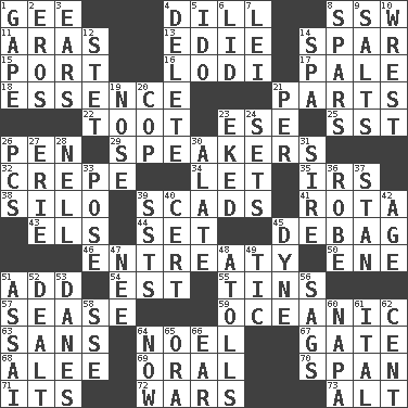 ACROSS 1. Unit of force equal to gravity 4. Deli pickle 8. Compass dir. 11. Ancient river in northeast Turkey 13. Singer Brickell 14. Practice fight 15. Sweet dark-red dessert wine 16. Farming town in central California 17. Diluted with white 18. Core 21. Actors' quests 22. A blast of a horn 23. Compass dir. 25. Fast jet (abbr.) 26. Animal enclosure 29. Orators 32. Streamer paper 34. Allow 35. Big collection agency 38. Grain storage tower 39. Large numbers or amounts 41. Round or rotation of duties 43. Raised railways 44. Put into a specified state 45. Debunk (Brit. slang) 46. Plea 50. Compass dir. 51. Find the sum of 54. Eastern Standard Time (abbr.) 55. Canisters 57. Gospel singer Marvin 59. Pertaining to the sea 63. Without 64. Christmas carol 67. Yard entry 68. Toward shelter 69. Taken by mouth 70. Connect, as a bridge 71. It is 72. Armed conflicts 73. The first octave above the treble staff DOWN 1. Stare wonderingly 2. Greek god of love 3. Hearing organs 4. Erase 5. Wedding promise 6. Flaplike covering 7. Luau accessory 8. Practice fights 9. Table seasonings 10. Take or capture by force 12. Proofreading order 14. Health resort 19. Characteristic smell of wine 20. Police officer (slang) 21. For each 23. Supplemented with great effort 24. Puts into a specified state 26. Personal Computers (abbr.) 27. 4th largest of the Great Lakes 28. 1994 drama film starring Jodie Foster 30. Having winglike extensions 31. Title for a man of rank and authority 33. Introduce or present, as a question 36. Loose flowing garment 37. Comedian Laurel of Laurel & Hardy 39. Fast planes 40. Sure thing 42. Ripen 45. Centimeter-gram-second unit of force 47. Born 48. Ringlike coral islands and reefs 49. Nervous spasm 51. Slender Brazilian palm 52. Started a card game 53. Natives or inhabitants of Denmark 56. Sinks 58. Compass dir. 60. California wine valley 61. Slanted text style (abbr.) 62. Penny 64. Immediately 65. Mouth or opening 66. Ewer handle