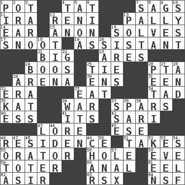 ACROSS 1. Plant holder 4. Make lace 7. Droops 11. Lyricist Gershwin 12. Painter Guido (1575-1642) 13. Chummy 14. Hearing organ 15. Soon (poet.) 16. Finds the solution 17. Snout, nose 19. Aide 21. Large 23. Ancient Greek god of war 24. Scornful sounds 25. Neckwear 26. Parent Teacher Assoc. 29. Sports stadium 30. Followers of ems 31. Car or cant ending 32. Period 33. Consume 34. Small boy 35. Krazy ___ of comics 36. Armed conflict 37. Practice fights 40. Double-curved letter 41. ___ a Wonderful Life 42. Indian skirt 43. Old wives' tales, e.g. 45. Compass dir. 46. Dwelling 51. Receives possession of 55. Speaker 56. Hollow 58. Night before a holiday 59. Carrier 60. Of or related to the anus 61. Snakelike fish 62. SW Saudi Arabia district 63. Acura sports coupe 64. Overdraft (abbr.) DOWN 1. Sliced desserts 2. NW Algerian seaport 3. Pacific island yam 4. "___ Little Indians" 5. Small Philippine buffalo 6. Metal containers 7. Table seasonings 8. Inventor's middle name 9. Small, secluded valley 10. System (abbr.) 12. Food allowance for one day 13. Introduce or present, as a question 16. Titles for men of rank and authority 18. Mitch Miller's instrument 20. Virtuous person 22. Girls' org. (abbr.) 24. Naughty children 25. Lacerates 26. _ dish (used to culture cells) 27. Beverages made from leaves 28. Added to 29. Caspian sea tributary 32. Supplement with great effort 33. Consumed 36. One who wires 37. Compass dir. 38. Soft color 39. Type of rug 43. 61 cubic inches 44. Aroma 46. Roll call or roster of names 47. Greek god of love 48. Suttee (variant) 49. Burn to charcoal 50. Immeasurably long periods of time 52. Peachy ____! 53. Nights before holidays 54. Itself 57. Not strict