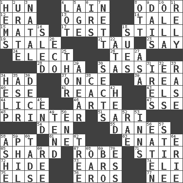 ACROSS 1. Attila the _ 4. (Had) reclined 8. Scent 12. Period 13. Legendary monster 14. Story 15. Floor protectors 17. Trial 18. Not moving 19. Having lost freshness 21. The 19th letter of the Greek alphabet 23. Declare 24. Voters do this 26. Afternoon social gathering 28. Capital of the state of Qatar 30. More lively and spirited 34. Possessed 37. At one time in the past 39. Length times width 40. Compass dir. 41. Arrive at 43. Raised railways 44. Louse (plural) 46. Johnson of "Laugh-In" 47. Compass dir. 48. Hard copy producer 51. Indian skirt 54. Lair 55. Natives or inhabitants of Denmark 58. Fitting 61. Fish or hair follower 63. Related on the mother's side 65. Pottery fragment 67. Loose flowing garment 71. Commotion 72. Flintstone garb 73. Hearing organs 74. Connecticut Ivy Leaguer 75. Otherwise 76. Greek god of love 77. Born DOWN 1. Is hesitant and indecisive 2. A salt of uric acid 3. Relating to or accompanying birth 4. Car dealer's back yard 5. Grow older 6. Big collection agency 7. Remaining after all deductions 8. Baseball player Mel 9. Raised platform 10. Rounded earthenware pot or jar 11. Have confidence or faith in 16. Downhill vehicle 18. Institutes legal proceedings 20. Environmental prefix 22. "One Day ___ Time" 25. Son of Odin 27. White ___ sheet 29. Approach 30. Religious groups 31. Angers 32. Snakelike fish 33. To erase 34. Assist 35. SW Saudi Arabia district 36. Tenth: prefix 38. 4-wheeled motor vehicle 42. Froth on beer 45. Conclusion 49. Be inclined (to) 50. Compass dir. 52. Actress Charlotte 53. Restaurants 56. Consumed 57. Vertical member of a panel or frame 58. American tennis player Robert 59. Silvers or Donahue 60. Bits 62. Woody plant 64. One of the Great Lakes 66. To riddle 68. Boat paddle 69. Sis' sibling 70. Double-curved letter